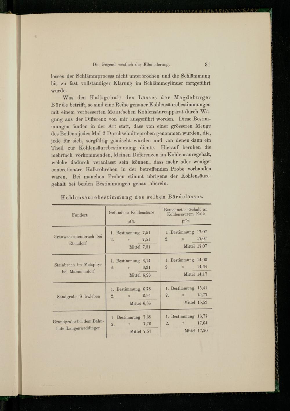 Was den Kalkgehalt des Lösses der Magdeburger Börde betrifft, so sind eine Reihe genauer Kohlensäurebestimmungen mit einem verbesserten MoOHR’schen Kohlensäureapparat durch Wägung aus der Differenz von mir ausgeführt worden. Diese Bestimmungen fanden in der Art statt, dass von einer grösseren Menge des Bodens jedes Mal 2 Durchschnittsproben genommen wurden, die, jede für sich, sorgfältig gemischt wurden und von denen dann ein Theil zur Kohlensäurebestimmung diente. Hierauf beruhen die mehrfach vorkommenden, kleinen Differenzen im Kohlensäuregehalt, welche dadurch veranlasst sein können, dass mehr oder weniger coneretionäre Kalkröhrehen in der betreffenden Probe vorhanden waren. Bei manchen Proben stimmt übrigens der Kohlensäureehalt bei beiden Bestimmungen genau überein.