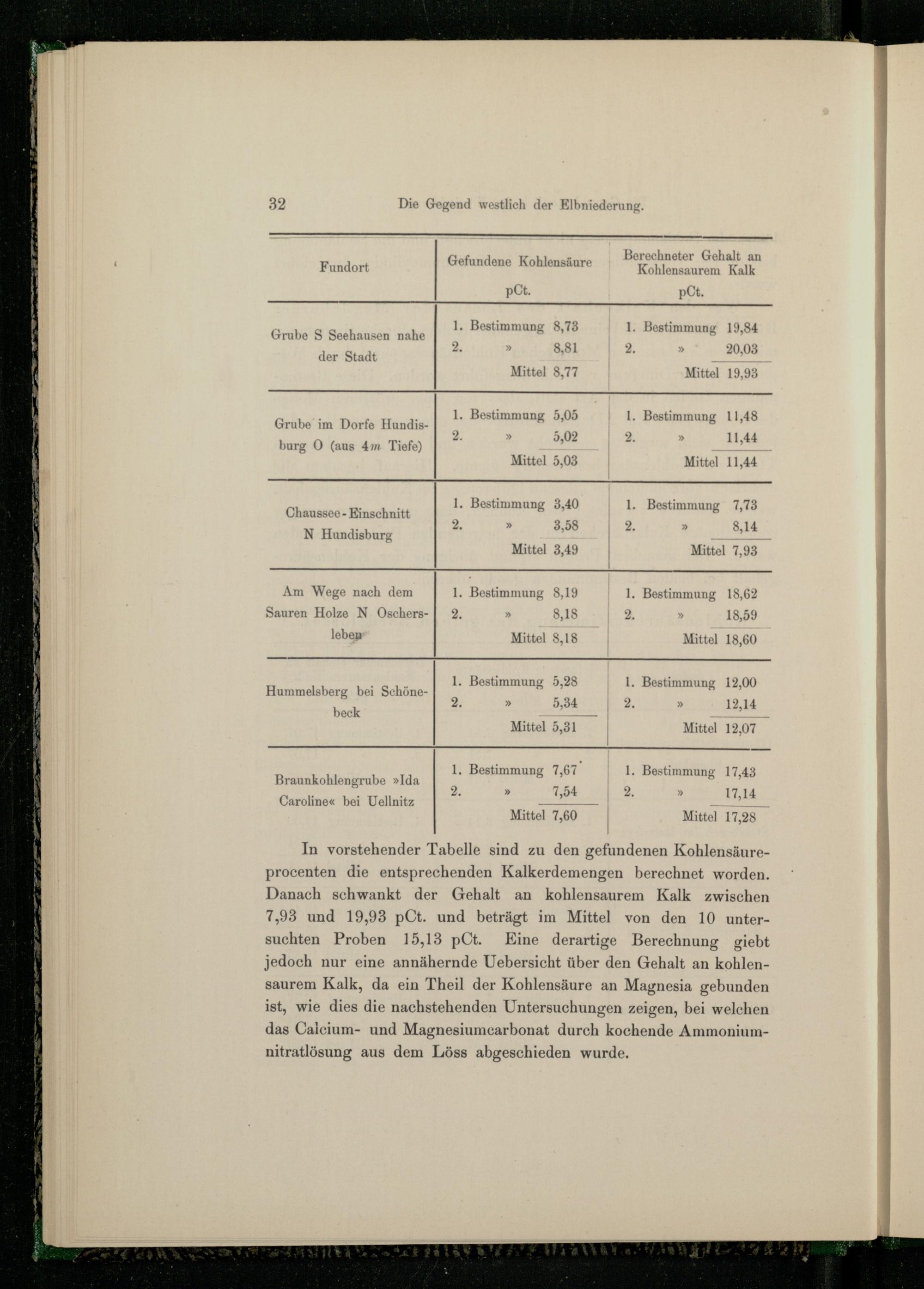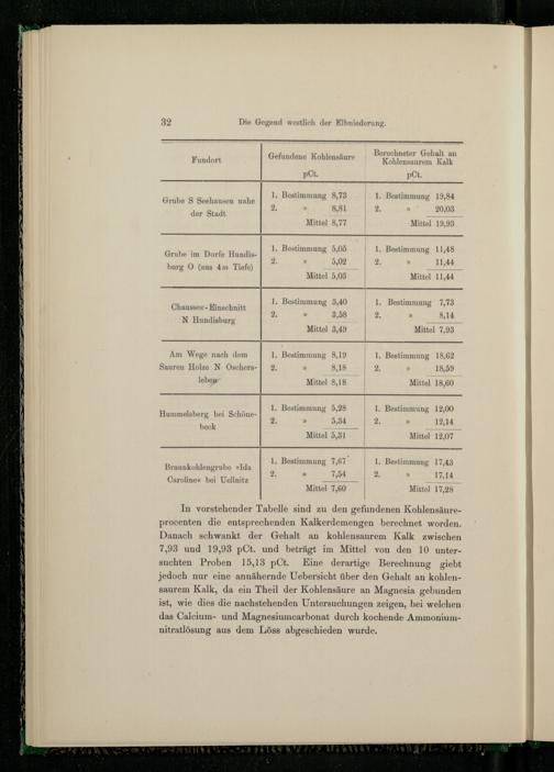 In vorstehender Tabelle sind zu den gefundenen Kohlensäureprocenten die entsprechenden Kalkerdemengen berechnet worden. Danach schwankt der Gehalt an kohlensaurem Kalk zwischen 7,93 und 19,93 pCt. und beträgt im Mittel von den 10 untersuchten Proben 15,13 pCt. Kine derartige Berechnung giebt jedoch nur eine annähernde Uebersicht über den Gehalt an kohlensaurem Kalk, da ein Theil der Kohlensäure an Magnesia gebunden