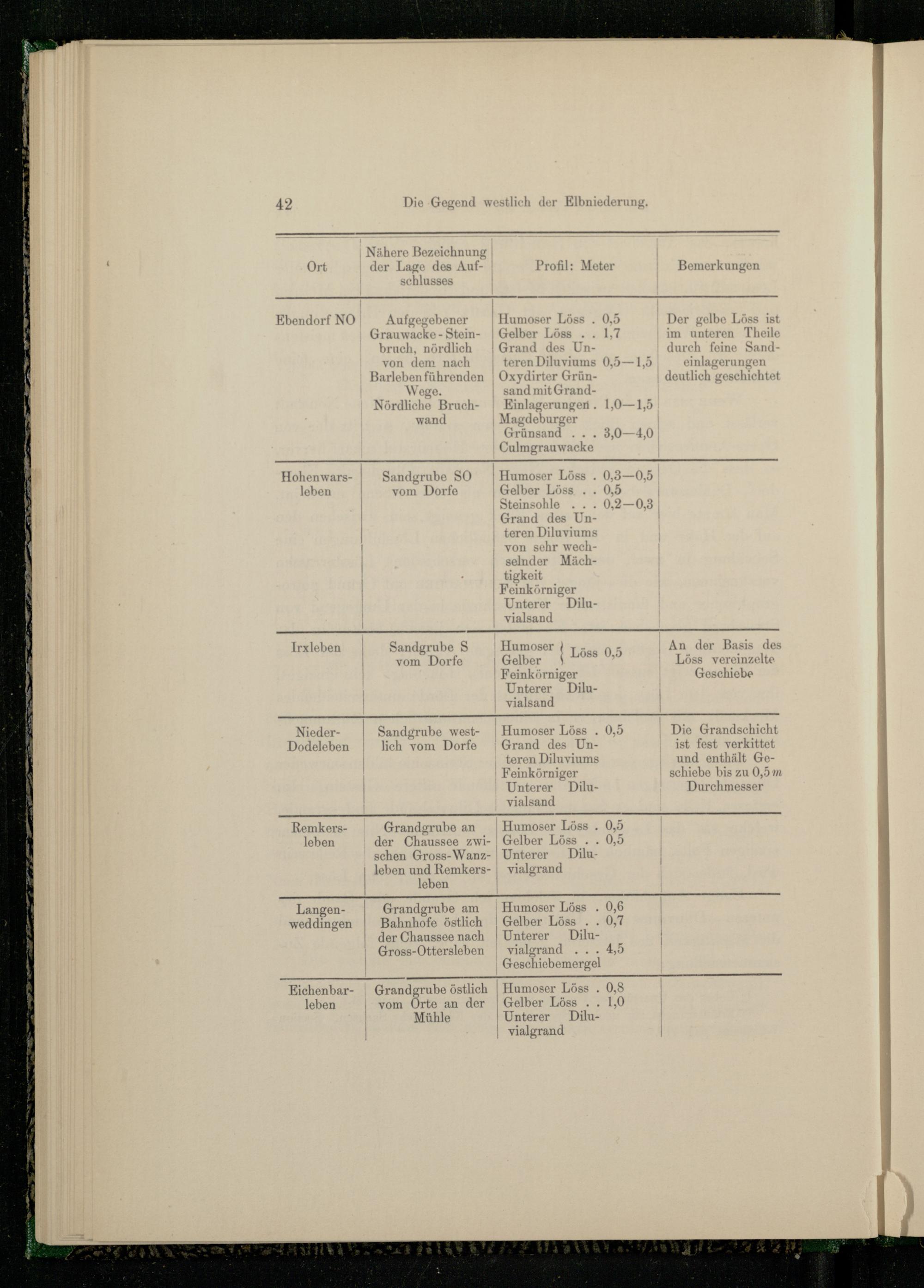 Ebendorf NO Aufgegebener Hun 0,5 D IbeL is Grauwacke- Ste Gell LÖös 1,7 m unt a N bruc nördlick G1 l d I Sand ( de D 0,5—1,5 eI Weg sand Grai n Nördlic Bruck Einlagerungeri. 1,0—1,5 wand Magdeburgeı Grünsand ,0—4,0 Culmgrauv Hohenwars Sandgrube SO Löss. 0,3—0,5 lebeı vom Dorfe| S 0,5 Stel 0,2—0,3 Grand des| teren Dilu I von sehr we selnd M heinkörnigeır Unterer DiluIrxleben Sandgrube S N An der Basis de vom Dorfe(© Löss vereinzelte ) i Geschiebe Jnterer Diluvialsand Nieder Sandgrube west- umoser Löss. 0,5 Die Grandschicht Dodeleben lich vom Dorfe Grand des Un- ist fest verkittet teren Diluviums und enthält Geteinkörn schiebe bis zu 0,5 m Durchmesser Remkers- Grandgrube an umoser Löss. 0,5 leben der Chaussee zwi-| Gelber Löss.. 0,5 schen Gross-Wanz-| Untereı Dilu leben und Remkers-| vialgrand leben A ee Langen- Grandgrube am Humoser Löss. 0,6 weddingen Bahnhofe östlich| Gelber Löss.. 0,7 der Chaussee nach| Unterer DiluGross-Ottersleben vialgrand... 4,5