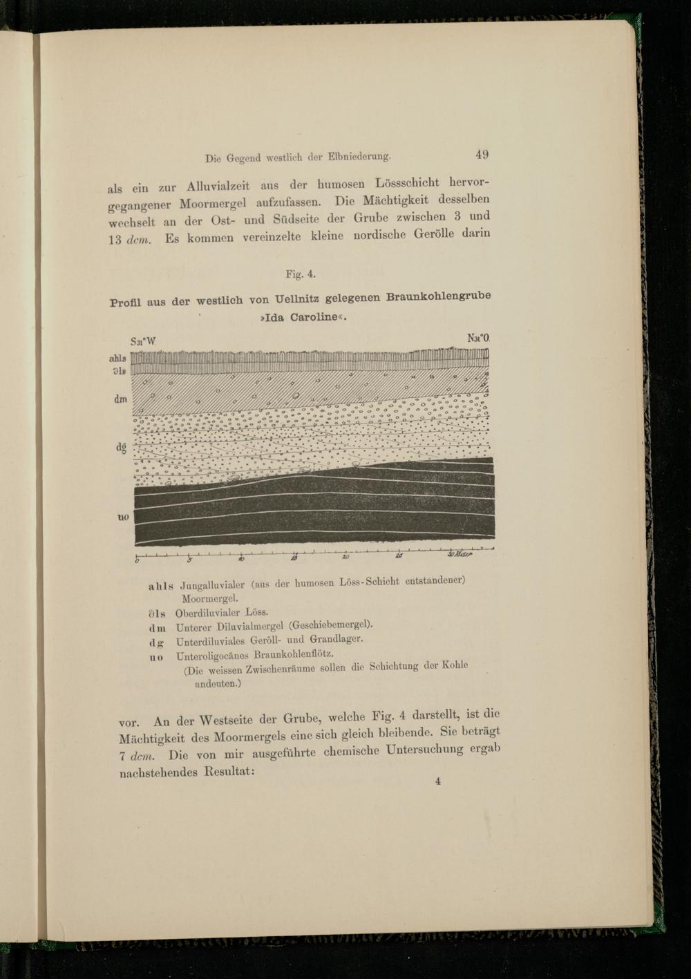 u Na3°0 ET TTTTT A TTN AM M HD ck Apr RAR 0 F DD Fl 2 29 Mader ahls Jungalluvialer(aus der humosen Löss- Schicht entstandener) Moormergel. 3ls Oberdiluvialer Löss. dm Unterer Diluvialmergel(Geschiebemergel). dg Unterdiluviales Geröll- und Grandlager. uo Unteroligocänes Braunkohlenflötz. (Die weissen Zwischenräume sollen die Schichtung der Kohle andeuten.) vor. An der Westseite der Grube, welche Fig. 4 darstellt, ist die Mächtigkeit des Moormergels eine sich gleich bleibende. Sie beträgt