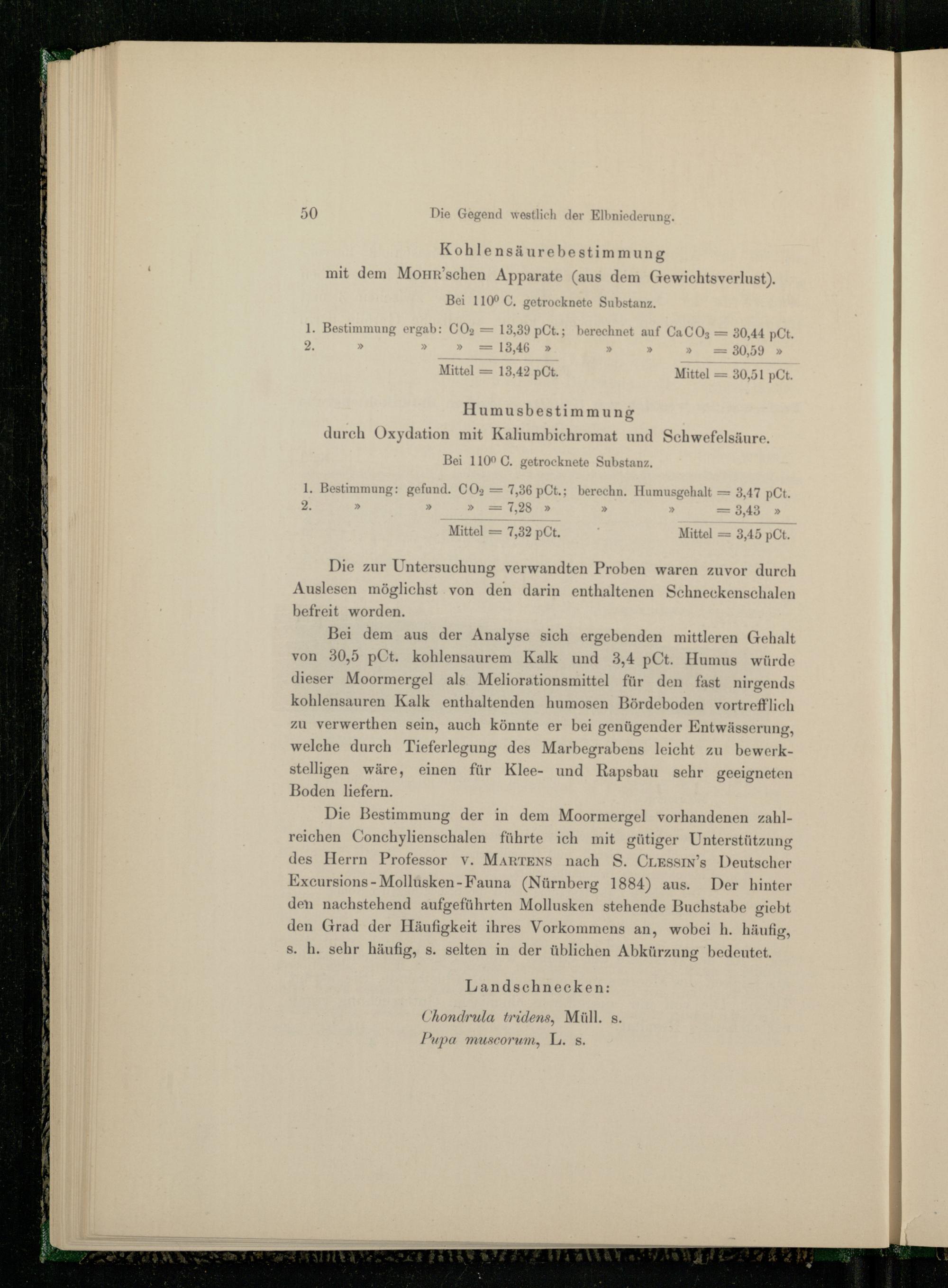 zei dem aus der Analyse sich ergebenden mittleren Gehalt von 50,5 pCt. kohlensaurem Kalk und 3,4 pCt. Humus würde dieser Moormergel als Meliorationsmittel für den fast nirgends kohlensauren Kalk enthaltenden humosen Bördeboden vortrefflich zu verwerthen sein, auch könnte er bei genügender Entwässerung, welche durch Tieferlegung des Marbegrabens leicht zu bewerkstelligen wäre, einen für Klee- und Rapsbau sehr geeigneten zoden liefern.