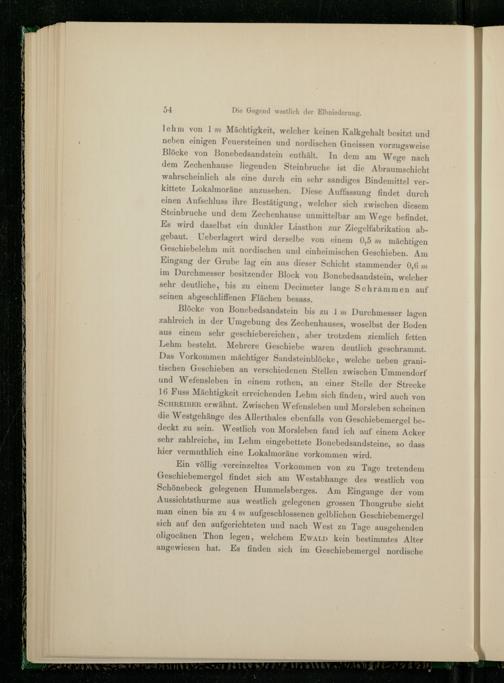 Blöcke von Bonebedsandstein bis zu 1 m Durchmesser lagen zahlreich in der Umgebung des Zechenhauses. woselbst der Boden aus einem sehr geschiebereichen. aber trotzdem ziemlich fetten Lehm besteht. Mehrere Geschiebe waren deutlich geschrammt. Das Vorkommen mächtiger Sandsteinblöcke. welche neben granitischen Geschieben an verschiedenen Stellen zwischen Ummendorf und Wefensleben in einem rothen, an einer Stelle der Strecke 16 Fuss Mächtigkeit erreichenden Lehm sich finden, wird auch von SCHREIBER erwähnt. Zwischen Wefensleben und Morsleben scheinen die Westgehänge des Allerthales ebenfalls von Geschiebemergel bedeckt zu sein. Westlich von Morsleben fand ich auf einem Acker sehr zahlreiche, im Lehm eingebettete Bonebedsandsteine, so dass hier vermuthlich eine Lokalmoräne vorkommen wird.