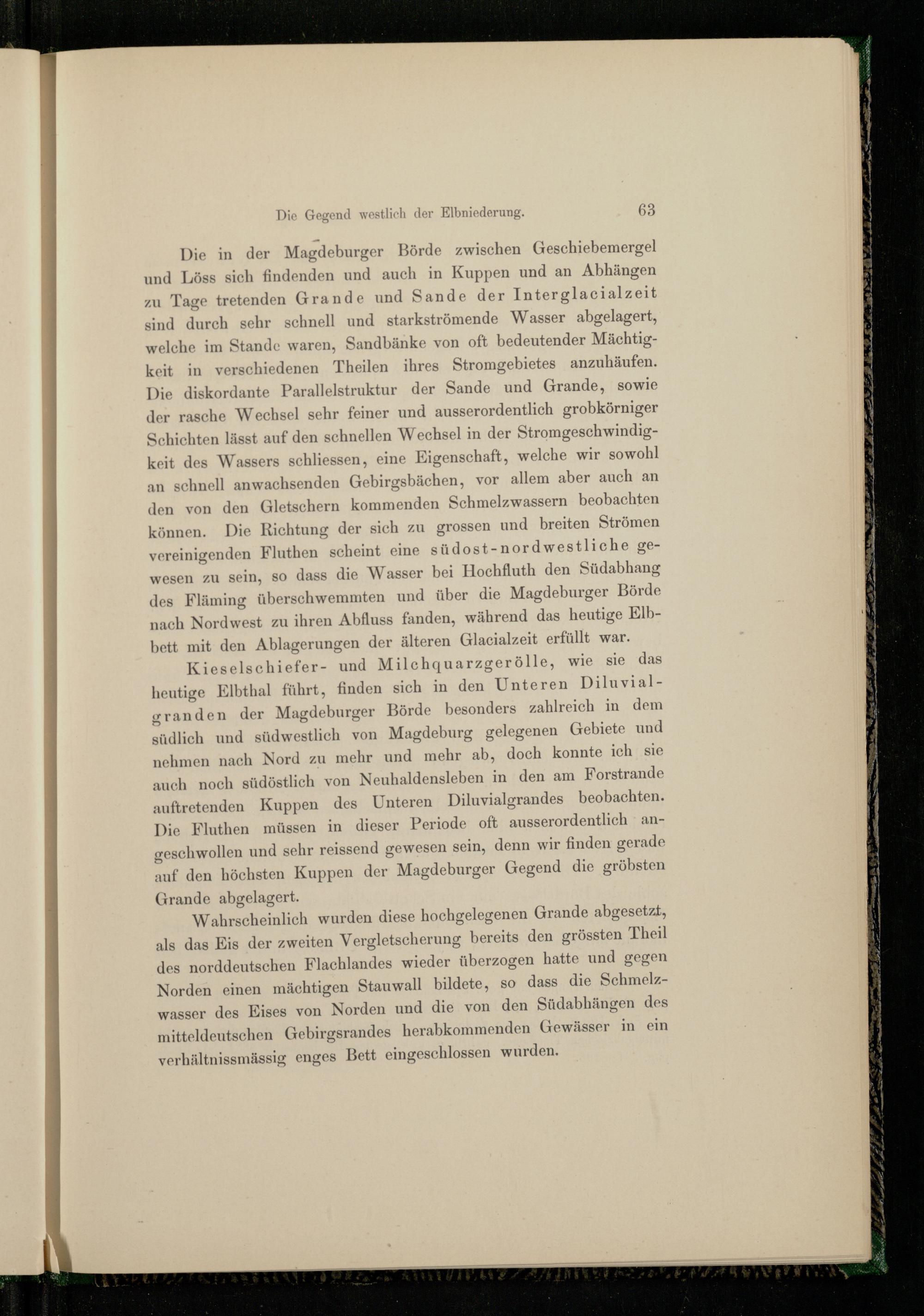 Tage tretenden Grande und Sande der Interglacialzeit sind durch sehr schnell und starkströmende Wasser abgelagert, welche im Stande waren, Sandbänke von oft bedeutender Mächtigkeit in verschiedenen Theilen ihres Stromgebietes anzuhäufen. Die diskordante Parallelstruktur der Sande und Grande, sowie der rasche Wechsel sehr feiner und ausserordentlich grobkörniger Schichten lässt auf den schnellen Wechsel in der Stromgeschwindigkeit des Wassers schliessen, eine Eigenschaft, welche wir sowohl an schnell anwachsenden Gebirgsbächen, vor allem aber auch an den von den Gletschern kommenden Schmelzwassern beobachten können. Die Richtung der sich zu grossen und breiten Strömen vereinigenden Fluthen sc;heint eine Ssüdost-nordwestkiehe gewesen zu sein, so dass die Wasser bei Hochfluth den Südabhang des Fläming überschwemmten und über die Magdeburger Börde nach Nordwest zu ihren Abfluss fanden, während das heutige Elbbett mit den Ablagerungen der älteren Glacialzeit erfüllt war.