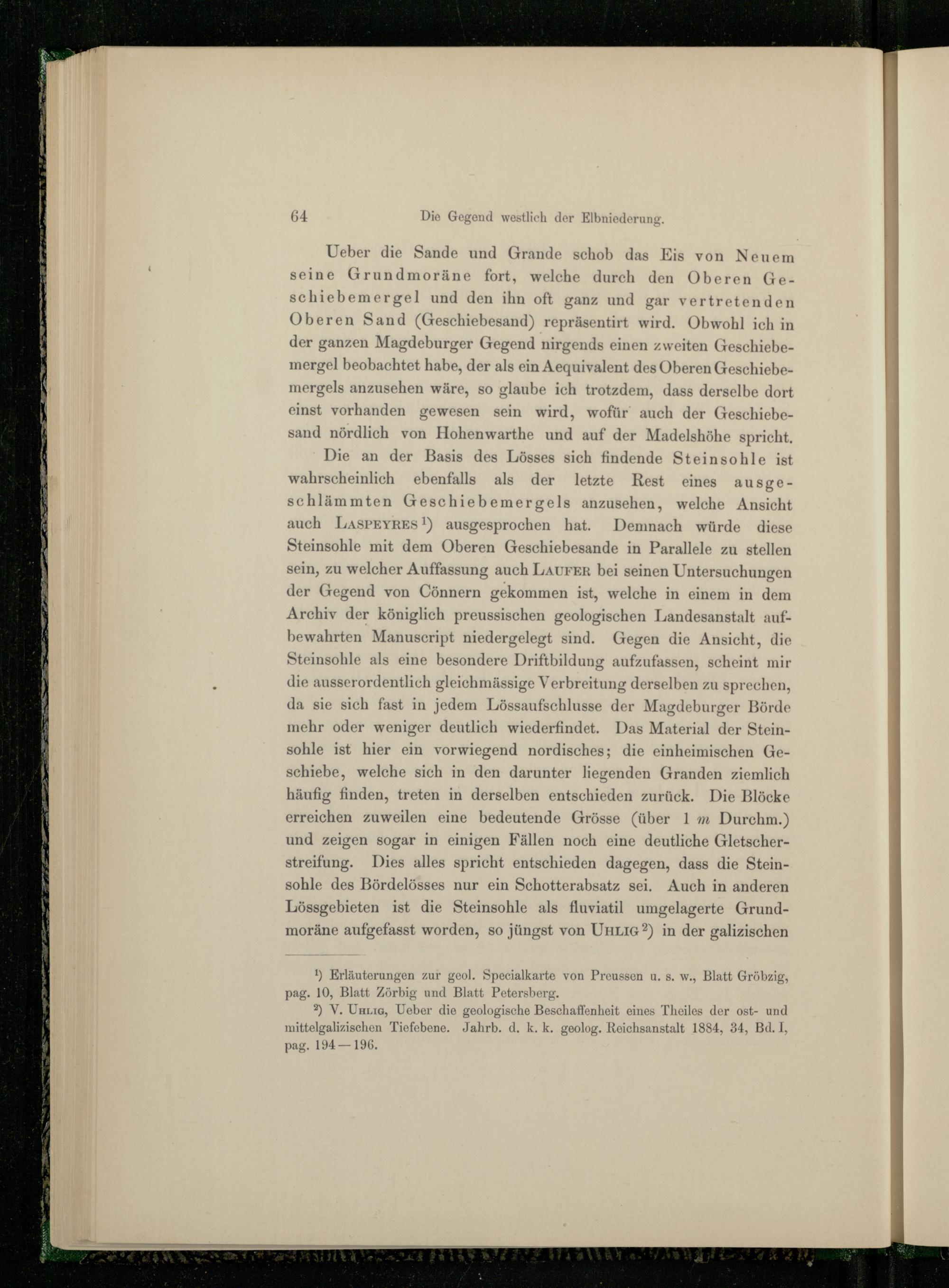 Die an der Basis des Lösses sich findende Steinsohle ist wahrscheinlich ebenfalls als der letzte Rest eines ausgeschlämmten Geschiebemergels anzusehen, welche Ansicht auch LASPEYRES!) ausgesprochen hat. Demnach würde diese Steinsohle mit dem Oberen Geschiebesande in Parallele zu stellen sein, zu welcher Auffassung auch LAUFER bei seinen Untersuchungen der Gegend von Cönnern gekommen ist, welche in einem in dem Archiv der königlich preussischen geologischen Landesanstalt aufbewahrten Manuscript niedergelegt sind. Gegen die Ansicht, die Steinsohle als eine besondere Driftbildung aufzufassen, scheint mir die ausserordentlich gleichmässige Verbreitung derselben zu sprechen, da sie sich fast in jedem Lössaufschlusse der Magdeburger Börde mehr oder weniger deutlich wiederfindet. Das Material der Steinsohle ist hier ein vorwiegend nordisches; die einheimischen Geschiebe, welche sich in den darunter liegenden Granden ziemlich häufig finden, treten in derselben entschieden zurück. Die Blöcke erreichen zuweilen eine bedeutende Grösse(über 1 m Durchm.) und zeigen sogar in einigen Fällen noch eine deutliche Gletscherstreifung. Dies alles spricht entschieden dagegen, dass die Steinsohle des Bördelösses nur ein Schotterabsatz sei. Auch in anderen Lössgebieten ist die Steinsohle als fluviatil umgelagerte Grund