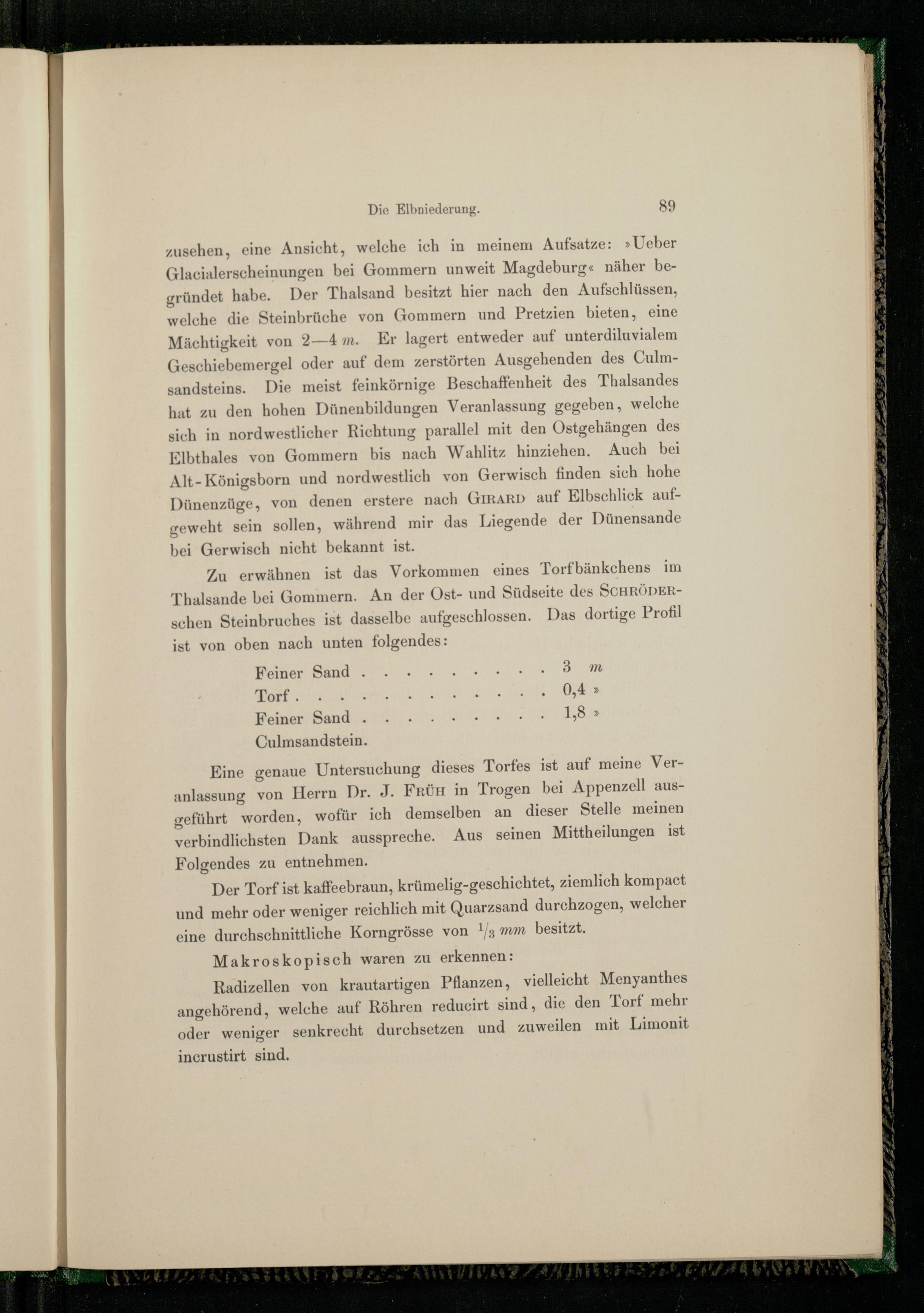 Zu erwähnen ist das Vorkommen eines Torfbänkchens im Thalsande bei Gommern. An der Öst- und Südseite des SCHRÖDERschen Steinbruches ist dasselbe aufgeschlossen. Das dortige Profil