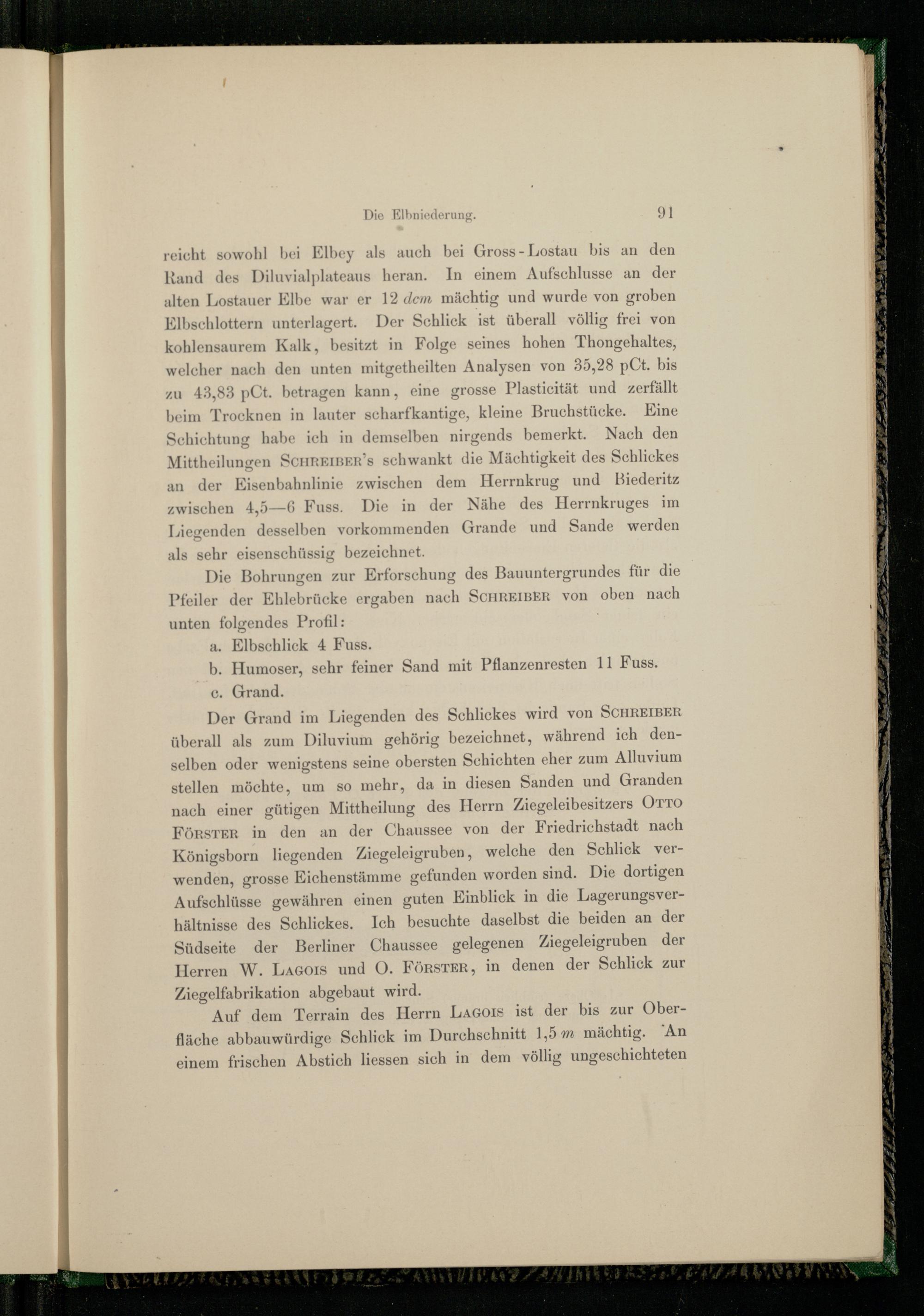 reicht sowohl bei Elbey als auch bei Gross-Lostau bis an den Rand des Diluvialplateaus heran. In einem Aufschlusse an der alten Lostauer Elbe war er 12 dem mächtig und wurde von groben Elbschlottern unterlagert. Der Schlick ist überall völlig frei von kohlensaurem Kalk, besitzt in Folge seines hohen Thongehaltes, welcher nach den unten mitgetheilten Analysen von 35,28 pCt. bis zu 43,83 pCt. betragen kann, eine grosse Plastieität und zerfällt beim Trocknen in lauter scharfkantige, kleine Bruchstücke. Eine Schichtung habe ich in demselben nirgends bemerkt. Nach den Mittheilungen SCHREIBER’s schwankt die Mächtigkeit des Schlickes an der Eisenbahnlinie zwischen dem Herrnkrug und Biederitz zwischen 4.5—6 Fuss. Die in der Nähe des Herrnkruges im Liegenden desselben vorkommenden Grande und Sande werden als sehr eisenschüssig bezeichnet.