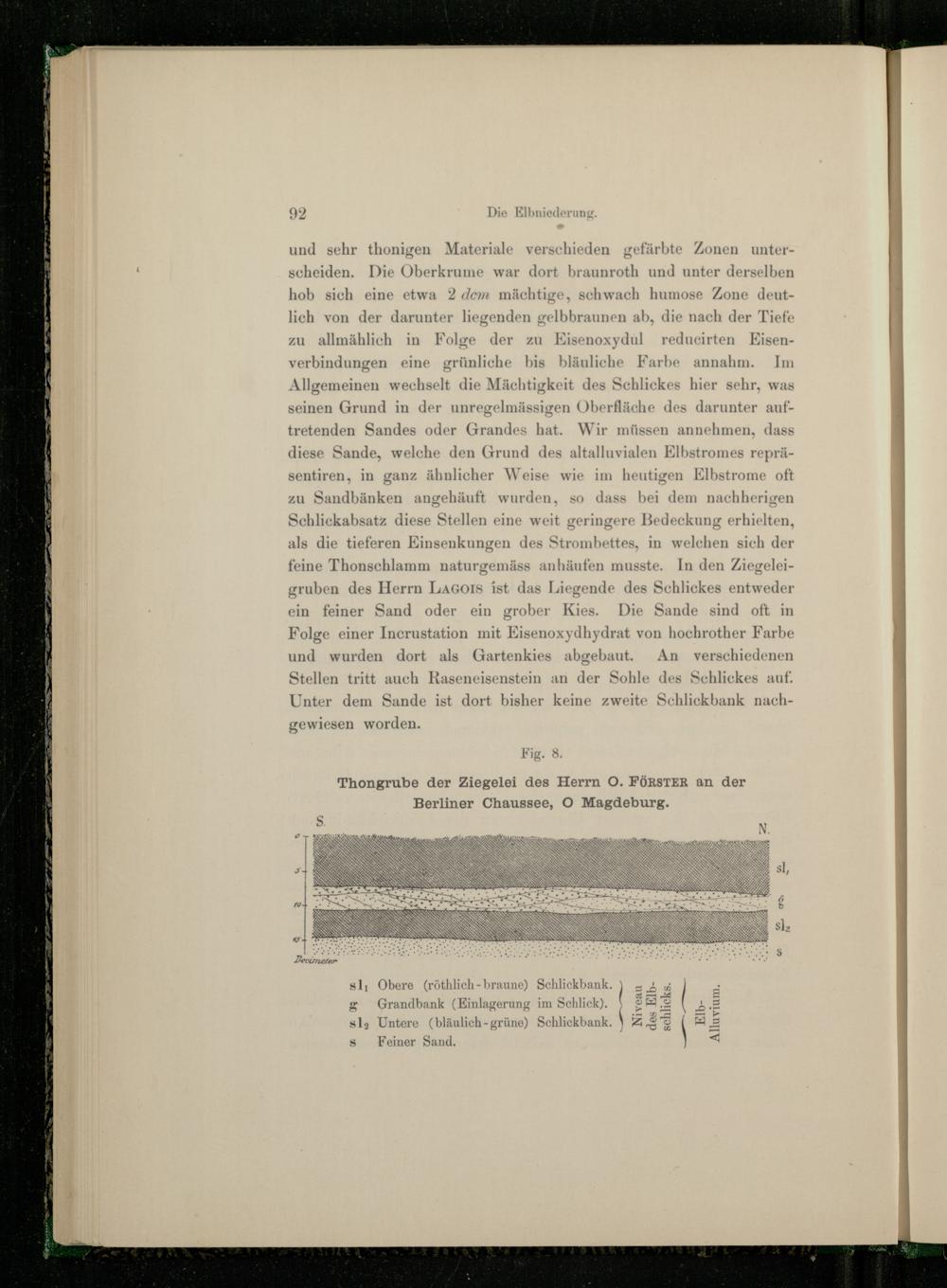 diese Sande, welche den Grund des altalluvia sentiren, in ganz ähnlicher Weise wie im heutigen Elbstrome oft zu Sandbänken angehäuft wurden, so dass bei dem nachherigen Schlickabsatz diese Stellen eine weit geringere Bedeckung erhielten, als die tieferen Einsenkungen des Strombettes, in welchen sich der feine Thonschlamm naturgemäss anhäufen musste. In den Ziegeleigruben des Herrn LAGOIsS ist das Liegende des Schlickes entweder ein feiner Sand oder ein grober Kies. Die Sande sind oft in Folge einer Inerustation mit Eisenoxydhydrat von hochrother Farbe und wurden dort als Gartenkies abgebaut. An verschiedenen Stellen tritt auch Raseneisenstein an der Sohle des Schlickes auf. Unter dem Sande ist dort bisher keine zweite Schlickbank nach