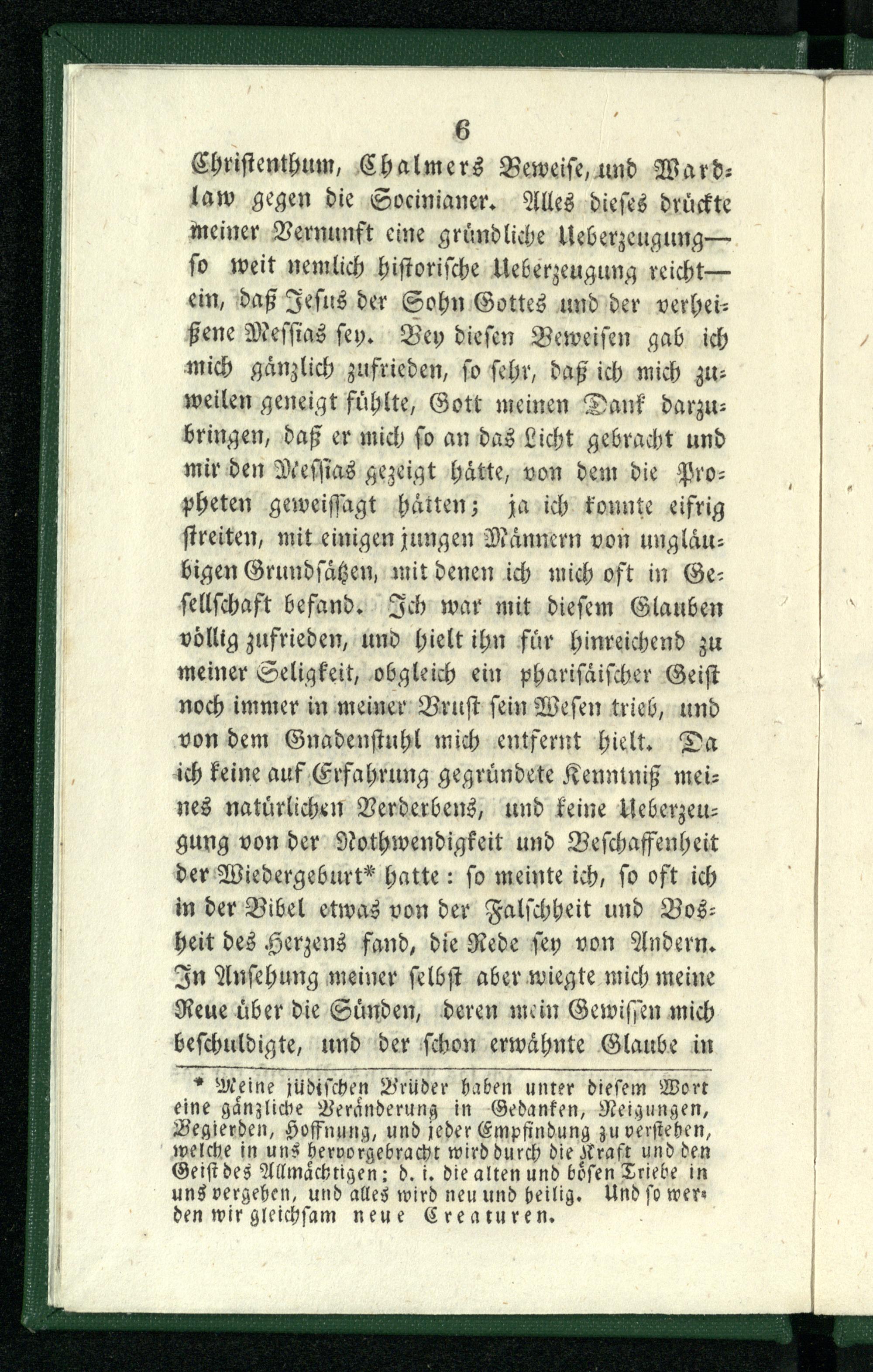 Christenthum, Chalmers Beweise, und Ward- law gegen die Socinianer. Alles dieses drückte meiner Vernunft eine gründliche Ueberzeugung — so weit nemlich historische Ueberzeugung reicht — ein, daß Jesus der Sohn Gottes und der verheißene Messias sey. Bey diesen Beweisen gab ich mich gänzlich zufrieden, so sehr, daß ich mich zuweilen geneigt fühlte, Gott meinen Dank darzubringen, daß er mich so an das Licht gebracht und mir den Messias gezeigt hätte, von dem die Propheten geweissagt hätten; ja ich konnte eifrig streiten, mit einigen jungen Männern von ungläubigen Grundsätzen, mit denen ich mich oft in Gesellschaft befand. Ich war mit diesem Glauben völlig zufrieden, und hielt ihn für hinreichend zu meiner Seligkeit, obgleich ein pharisäischer Geist noch immer in meiner Brust sein Wesen trieb, und von dem Gnadenstuhl mich entfernt hielt. Da ich keine auf Erfahrung gegründete Kenntniß meines natürlichen Verderbens, und keine Ueberzeugung von der Nothwendigkeit und Beschaffenheit der Wiedergeburt* hatte: so meinte ich, so oft ich in der Bibel etwas von der Falschheit und Bosheit des Herzens fand, die Rede sey von Andern. In Ansehung meiner selbst aber wiegte mich meine Reue über die Sünden, deren mein Gewissen mich beschuldigte, und der schon erwähnte Glaube in