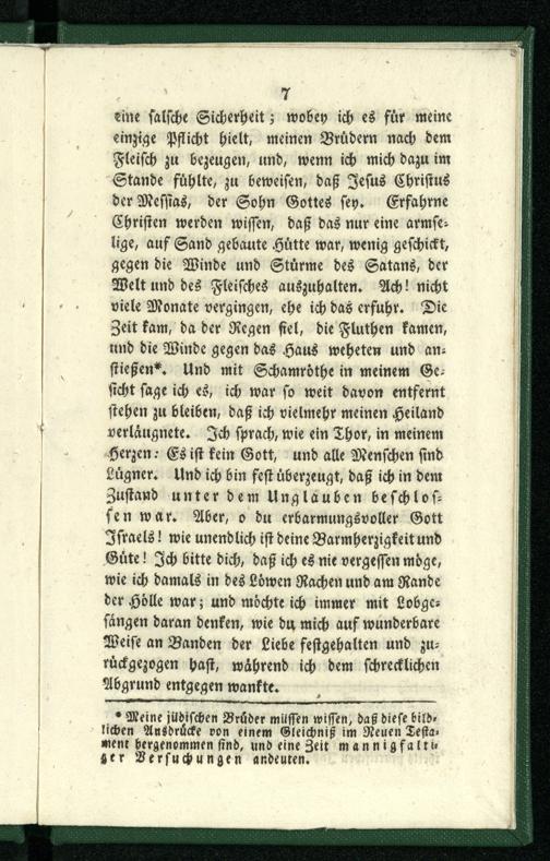 eine falsche Sicherheit; wobey ich es für meine einzige Pflicht hielt, meinen Brüdern nach dem Fleisch zu bezeugen, und, wenn ich mich dazu im Stande fühlte, zu beweisen, daß Jesus Christus der Messias, der Sohn Gottes sey. Erfahrne Christen werden wissen, daß das nur eine armselige, auf Sand gebaute Hütte war, wenig geschickt, gegen die Winde und Stürme des Satans, der Welt und des Fleisches auszuhalten. Ach! nicht viele Monate vergingen, ehe ich das erfuhr. Die Zeit kam, da der Regen fiel, die Fluthen kamen, und die Winde gegen das Haus wehrten und anstießen*. Und mit Schamröthe in meinem Gesicht sage ich es, ich war so weit davon entfernt stehen zu bleiben, daß ich vielmehr meinen Heiland verläugnete. Ich sprach, wie ein Thor, in meinem Herzen: nd Es ist kein Gott, und alle Menschen si Lügner. Und ich bin fest überzeugt, daß ich in dem Zustand unter dem Unglauben beschlossen war. Aber, o du erbarmungsvoller Gott Israels! wie unendlich ist deine Barmherzigkeit und Güte! Ich bitte dich, daß ich es nie vergessen möge, wie ich damals in des Löwen Rachen und am Rande der Hölle war; und möchte ich immer mit Lobge- sangen daran denken, wie du mich auf wunderbare Weise an Banden der Liebe festgehalten und zurückgezogen hast, während ich dem schrecklichen Abgrund entgegen wankte.