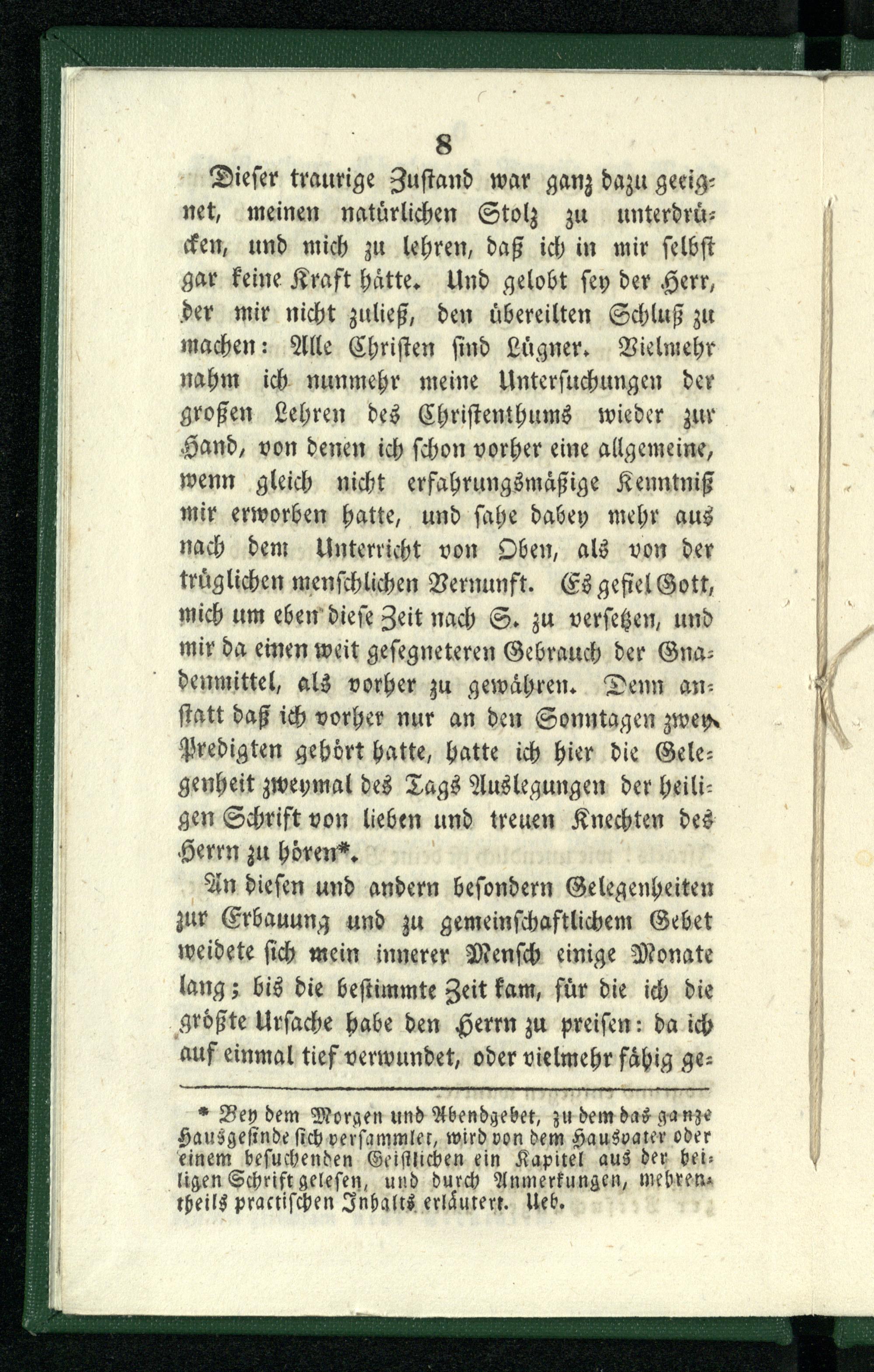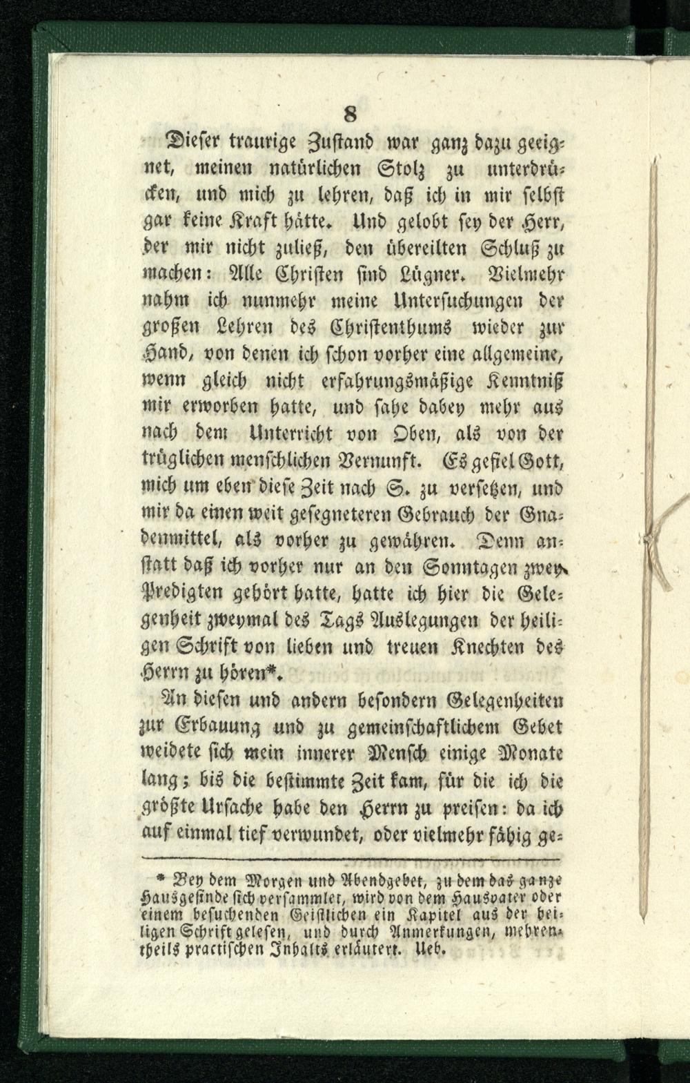 Dieser traurige Zustand war ganz dazu geeignet, meinen natürlichen Stolz zu unterdrücken, und mich zu lehren, daß ich in mir selbst gar keine Kraft hätte. Und gelobt sey der Herr, der mir nicht zuließ, den übereilten Schluß zu machen: Alle Christen sind Lügner. Vielmehr nahm ich nunmehr meine Untersuchungen der großen Lehren des Christenthums wieder zur Hand, von denen ich schon vorher eine allgemeine, wenn gleich nicht erfahrungsmäßige Kenntniß mir erworben hatte, und sahe dabey mehr aus nach dem Unterricht von Oben, als von der trüglichen menschlichen Vernunft. Es gefiel Gott, mich um eben diese Zeit nach S. zu versetzen, und mir da einen weit gesegneteren Gebrauch der Gnadenmittel, als vorher zu gewähren. Denn anstatt daß ich vorher nur an den Sonntagen zwey Predigten gehört hatte, hatte ich hier die Gelegenheit zweymal des Tags Auslegungen der heiligen Schrift von lieben und treuen Knechten des Herrn zu hören*.