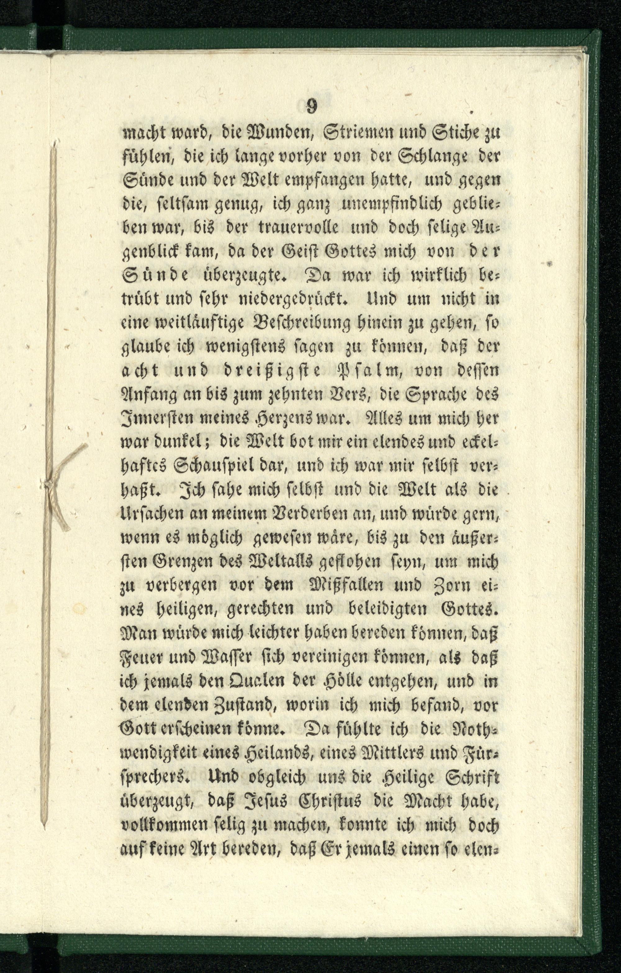macht ward, die Wunden, Striemen und Stiche zu fühlen, die ich lange vorher von der Schlange der Sünde und der Welt empfangen hatte, und gegen die, seltsam genug, ich ganz unempfindlich geblieben war, bis der trauervolle und doch selige Augenblick kam, da der Geist Gottes mich von der Sünde überzeugte. Da war ich wirklich betrübt und sehr niedergedrückt. Und um nicht in eine weitläuftige Beschreibung hinein zu gehen, so glaube ich wenigstens sagen zu können, daß der acht und dreißigste Psalm, von dessen Anfang an bis zum zehnten Vers, die Sprache des Innersten meines Herzens war. Alles um mich her war dunkel; die Welt bot mir ein elendes und eckel- haftcs Schauspiel dar, und ich war mir selbst verhaßt. Ich sahe mich selbst und die Welt als die Ursachen an meinem Verderben an, und würde gern, wenn es möglich gewesen wäre, bis zu den äußersten Grenzen des Weltalls geflohen seyn, um mich zu verbergen vor dem Mißfallen und Zorn eines heiligen, gerechten und beleidigten Gottes. Man würde mich leichter haben bereden können, daß Feuer und Wasser sich vereinigen können, als daß ich jemals den Qualen der Hölle entgehen, und in dem elenden Zustand, worin ich mich befand, vor Gott erscheinen könne. Da fühlte ich die Noth- wendigkeit eines Heilands, eines Mittlers und Fürsprechers. Und obgleich uns die Heilige Schrift überzeugt, daß Jesus Christus die Macht habe, vollkommen selig zu machen, konnte ich mich doch auf keine Art bereden, daß Er jemals einen so elen-