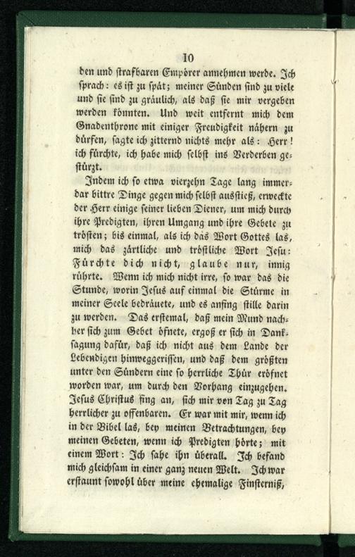 Indem ich so etwa vierzehn Tage lang immerdar bittre Tinge gegen mich selbst ausstieß, erweckte der Herr einige seiner lieben Diener, um mich durch ihre Predigten, ihren Umgang und ihre Gebete zu trösten; bis einmal, als ich das Wort Gottes las, mich das zärtliche und tröstliche Wort Jesu: Fürchte dich nicht, glaube nur, innig rührte. Wenn ich mich nicht irre, so war das die Stunde, worin Jesus auf einmal die Stürme in meiner Seele bedräuete, und es anfing stille darin zu werden. Das erstemal, daß mein Mund nachher sich zum Gebet öfnete, ergoß er sich in Danksagung dafür, daß ich nicht aus dem Lande der Lebendigen hinweggerissen, und daß dem größten unter den Sündern eine so herrliche Thür eröfnet worden war, um durch den Vorhang einzugehen. Jesus Christus fing an, sich mir von Tag zu Tag herrlicher zu offenbaren. Er war mit mir, wenn ich in der Bibel las, bey meinen Betrachtungen, bey meinen Gebeten, wenn ich Predigten hörte; mit einem Wort Ich sähe ihn überall. Ich befand mich gleichsam in einer ganz neuen Welt. Ich war erstaunt sowohl über meine ehemalige Finsterniß,
