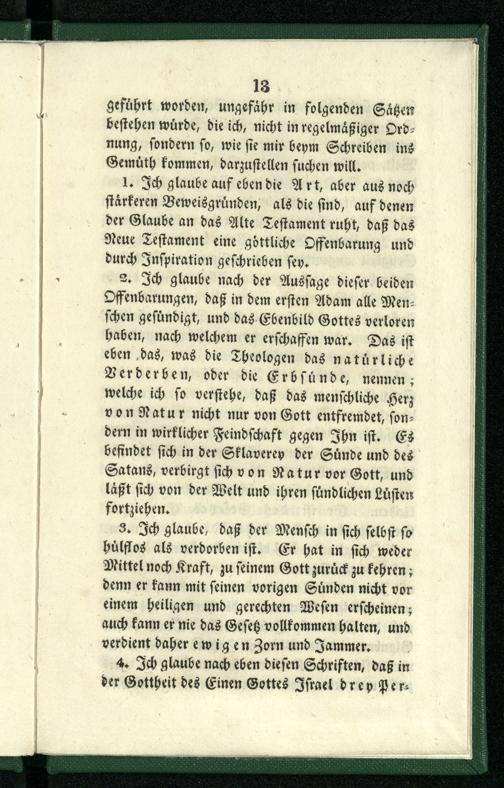 1. Ich glaube auf eben die Art, aber aus noch stärkeren Beweisgründen, als die sind, auf denen der Glaube an das Alte Testament ruht, daß das Neue Testament eine göttliche Offenbarung und durch Inspiration geschrieben sey.