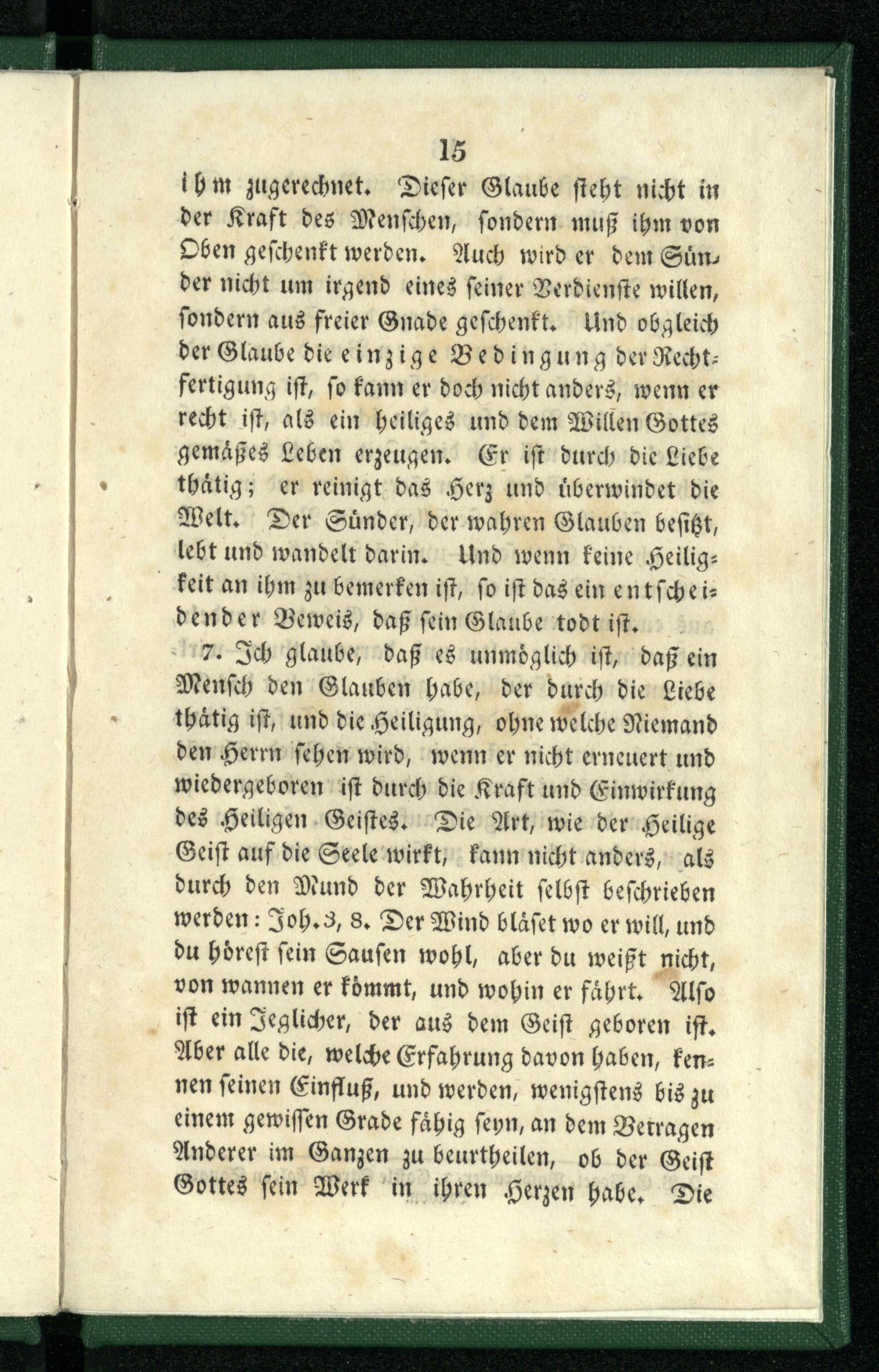 7- Ich glaube, daß es unmöglich ist, daß ein Mensch den Glauben habe, der durch die Liebe thätig ist, und die Heiligung, ohne welche Niemand den Herrn sehen wird, wenn er nicht erneuert und wiedergeboren ist durch die Kraft und Einwirkung des Heiligen Geistes. Die Art, wie der Heilige Geist auf die Seele wirkt, kann nicht anders, als durch den Mund der Wahrheit selbst beschrieben werden: Ioh.ch 8. Der Wind bläset wo er will, und du hörest sein Sausen wohl, aber du weißt nicht, von wannen er kömmt, und wohin er fährt. Also ist ein Jeglicher, der aus dem Geist geboren ist. Aber alle die, welche Erfahrung davon haben, kennen seinen Einfluß, und werden, wenigstens bis zu einem gewissen Grade fähig sepn, an dem Benagen Anderer im Ganzen zu beurtheilen, ob der Geist Gottes sein Werk in ihren Herzen habe. Die