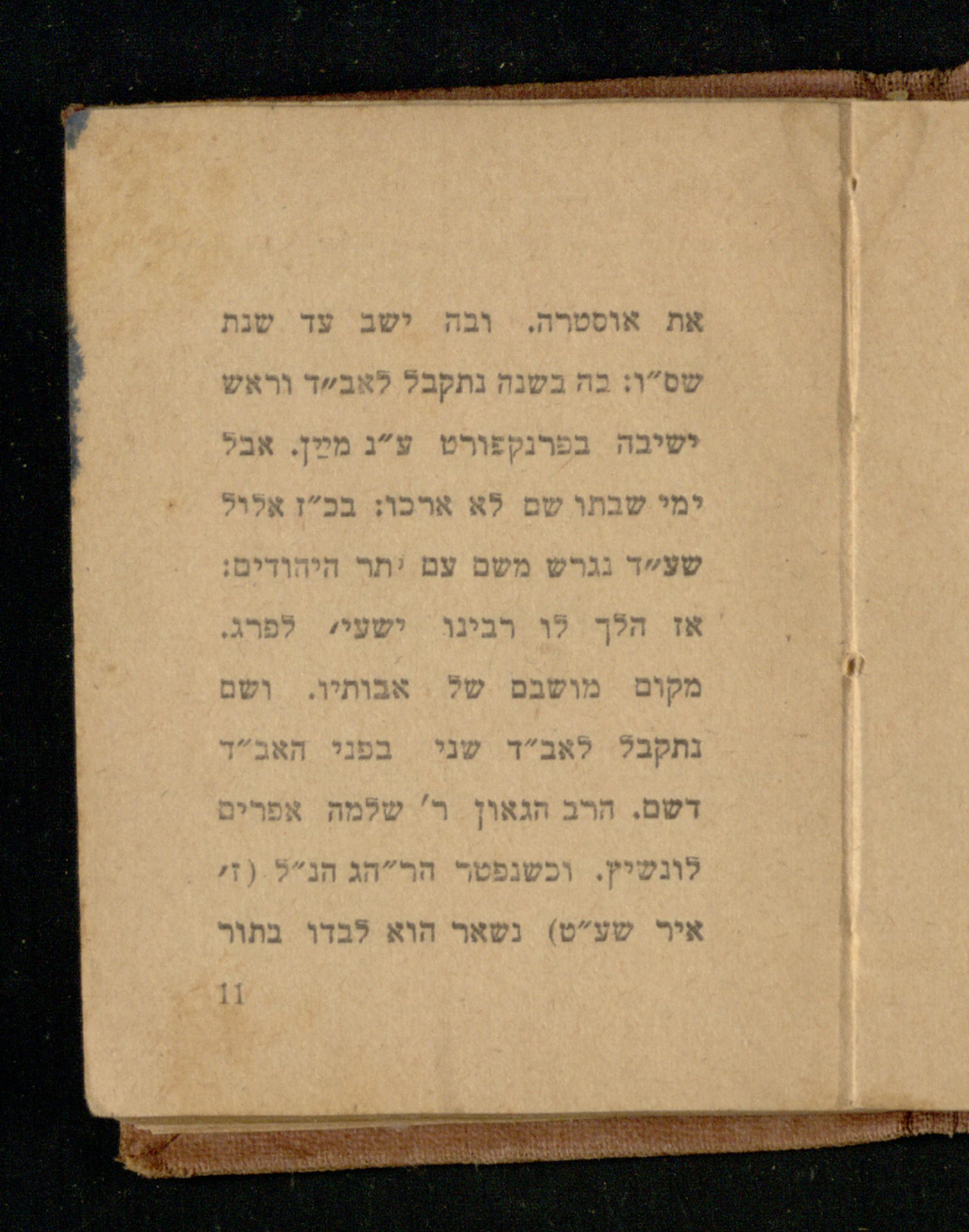 שס"ו: כה בשנה נתקבל לאב"ד וראש ישיבה בפרנקפורט ע"ג מײַן. אבל ימי שבתו שם לא ארכו: בכ"ז אלול שעיד נגרש משם עם יתר היהודים: