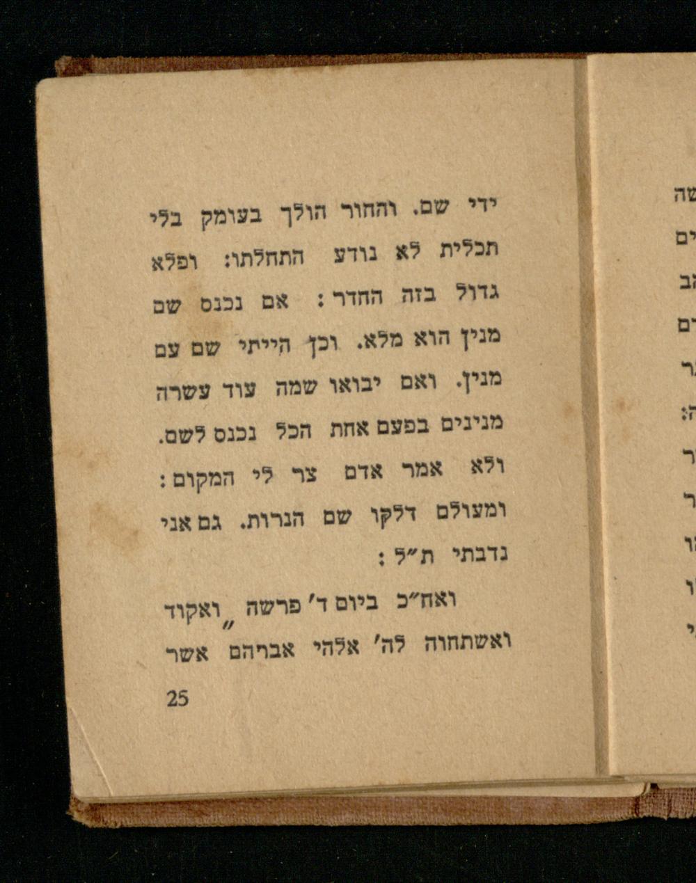 ידי שם, והחור הולך בעומק בלי תכלית לא נודע התחלתו: ופלא גדול בזה החדר: אם נכנס שם מנין הוא מלא. וכן הייתי שם עם מנין. ואם יבואו שמה עוד עשרה מנינים בפעם אחת הכל נכנס לשם. ולא אמר אדם צר לי המקום: