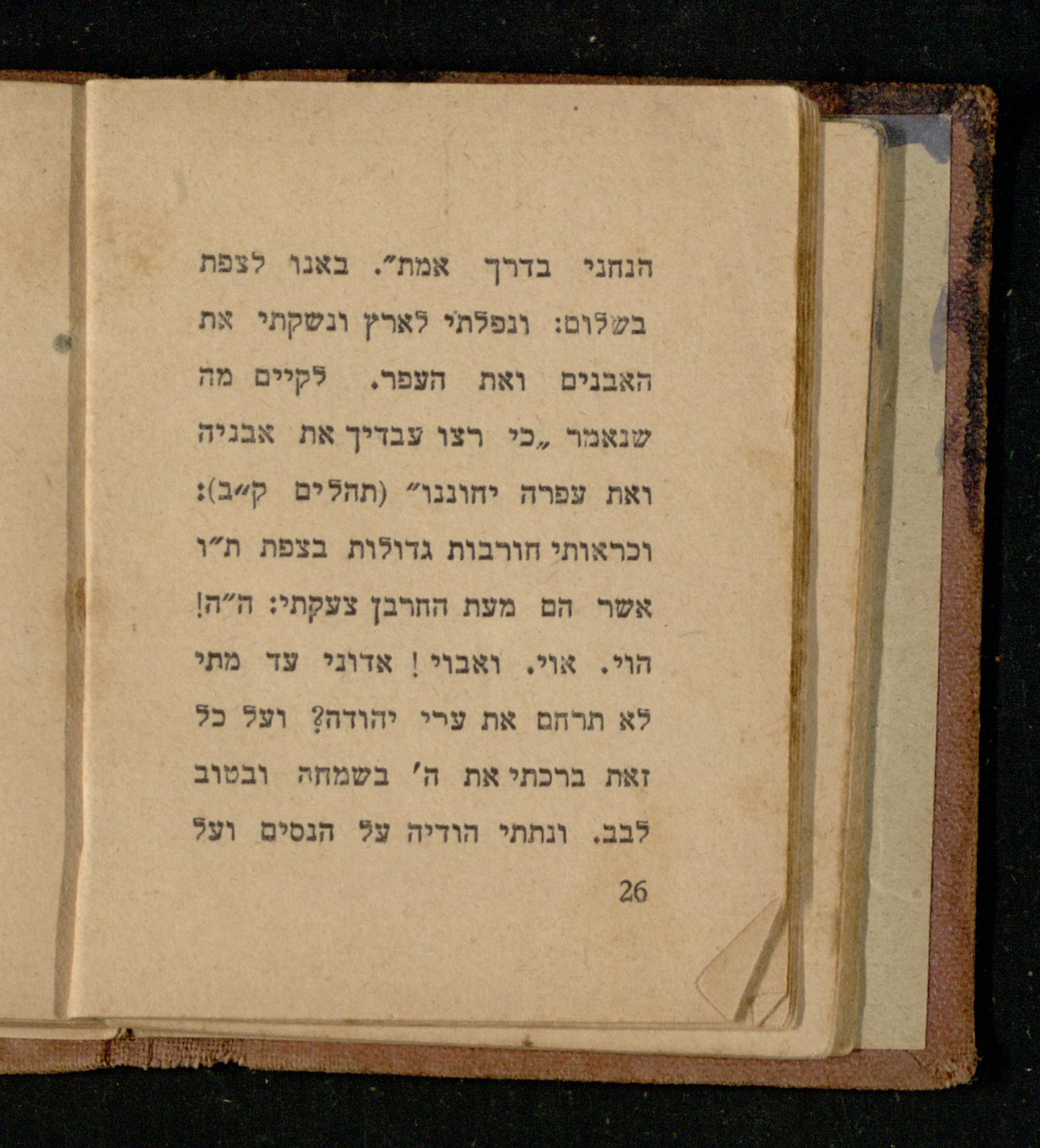 שנאמר כי רצו עבדיך את אבניה ואת עפרה יחוננו"( תהלים ק"ב): וכראותי חורבות גדולות בצפת ת"ו אשר הם מעת החרבן צעקתי: ה"ה! הוי. אוי ואבוי! אדוני עד מתי לא תרחם את ערי יהודה? ועל כל זאת ברכתי את ה' בשמחה ובטוב לבב. ונתתי הודיה על הנסים ועל