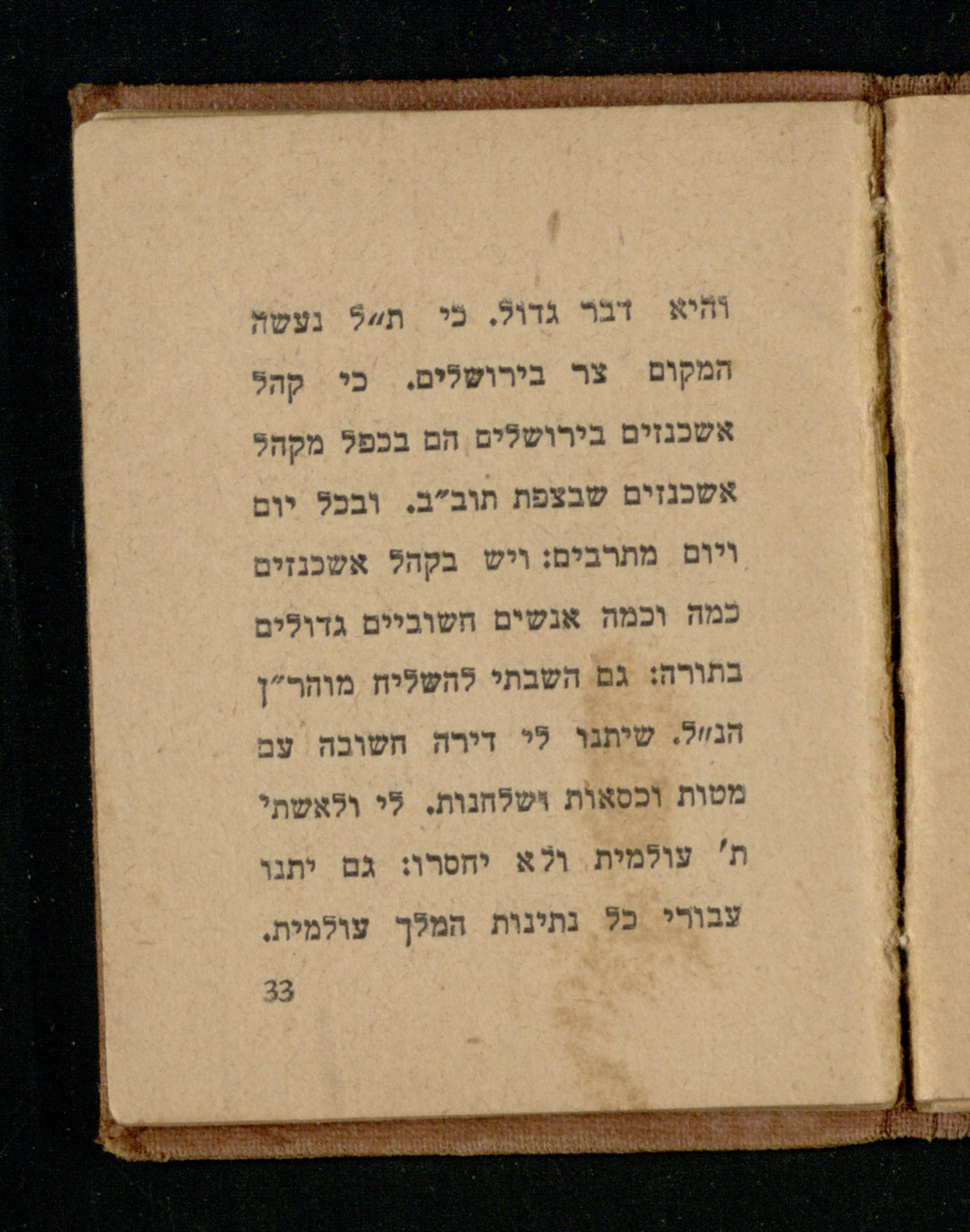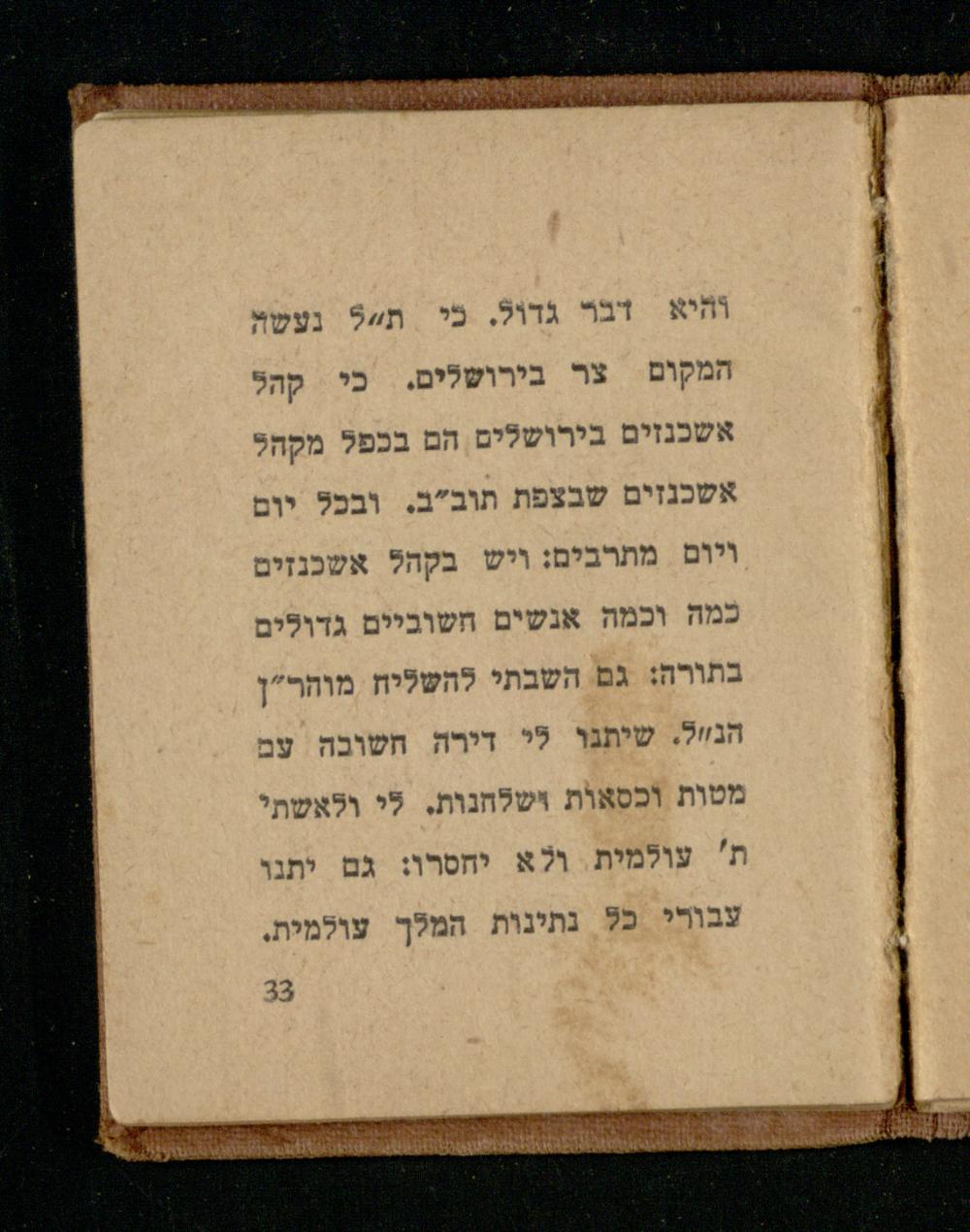 אשכנזים בירושלים הם בכפל מקהל אשכנזים שבצפת תוב"ב, ובכל יום ויום מתרבים: ויש בקהל אשכנזים כמה וכמה אנשים חשוביים גדולים בתורה: גם השבתי להשליח מוהר"ן הנ"ל. שיתנו לי דירה חשוכה עם מטות וכסאות ושלחנות. לי ולאשתי