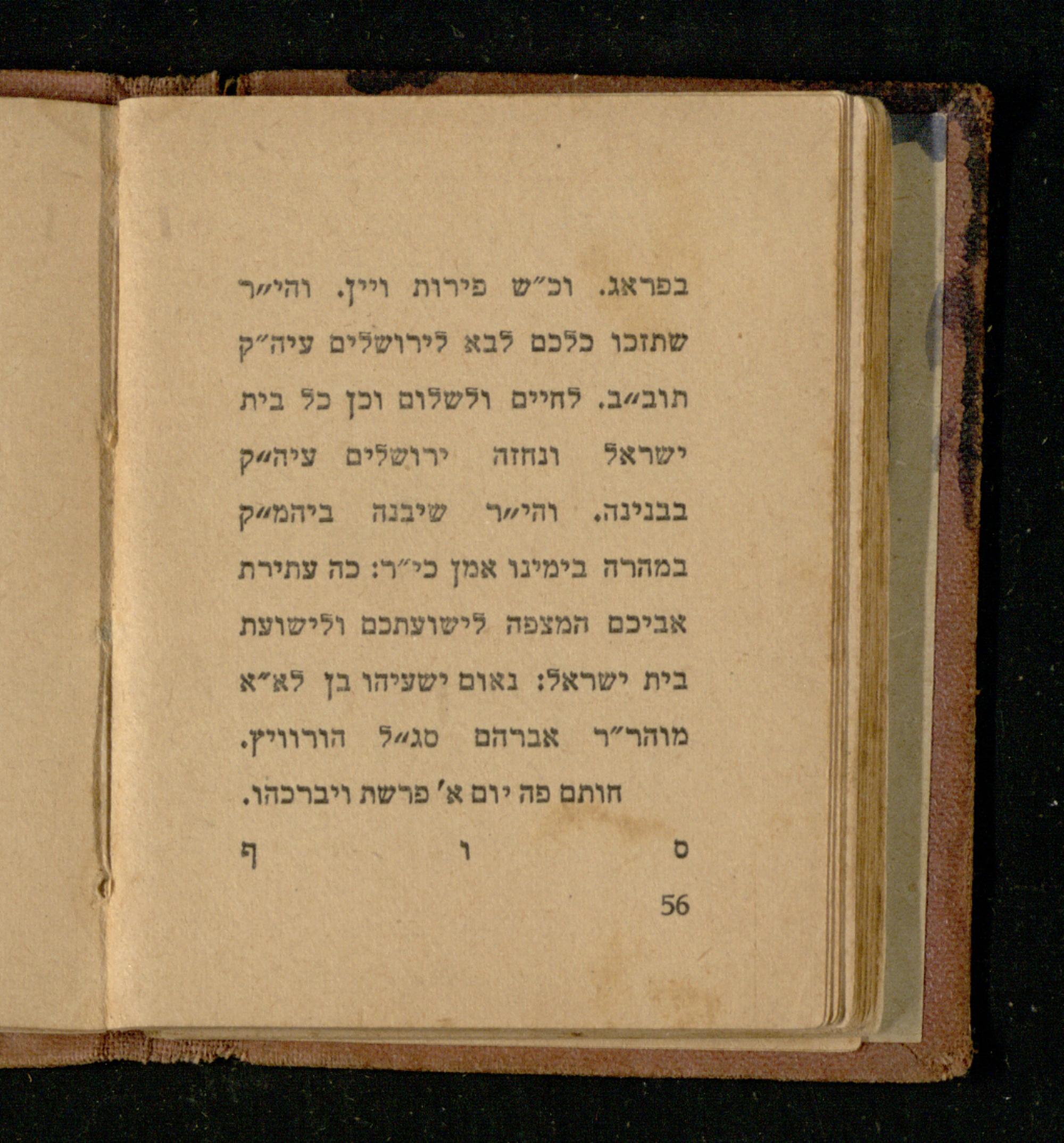 במהרה בימינו אמן כי"ר: כה עתירת אביכם המצפה לישועתכם ולישועת בית ישראל: נאום ישעיהו בן לא"א מוהר"ר אברהם סגל הורוויץ. חותם פה יום א' פרשת ויברכהו.