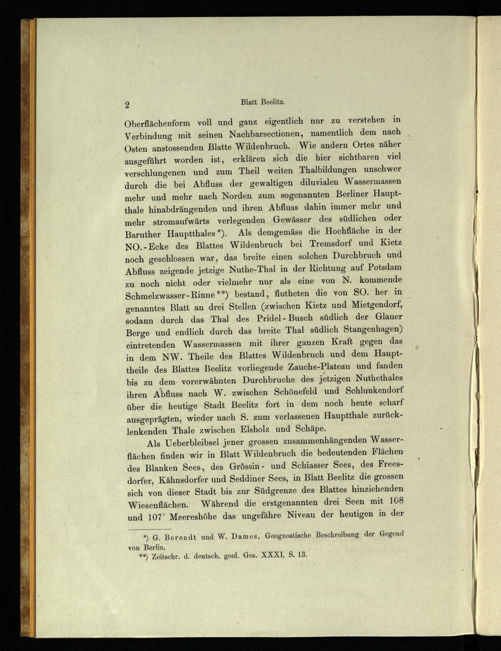Als Ueberbleibsel jener grossen zusammenhängenden W asserflächen finden wir in Blatt Wildenbruch die bedeutenden Flächen des Blanken Sees, des Grössin- und Schiasser Sees, des Freesdorfer, Kähnsdorfer und Seddiner Sees, in Blatt Beelitz die grossen sich von dieser Stadt bis zur Südgrenze des Blattes hinziehenden Wiesenflächen. Während die erstgenannten drei Seen mit 1068 und 107’ Meereshöhe das ungefähre Niveau der heutigen in der