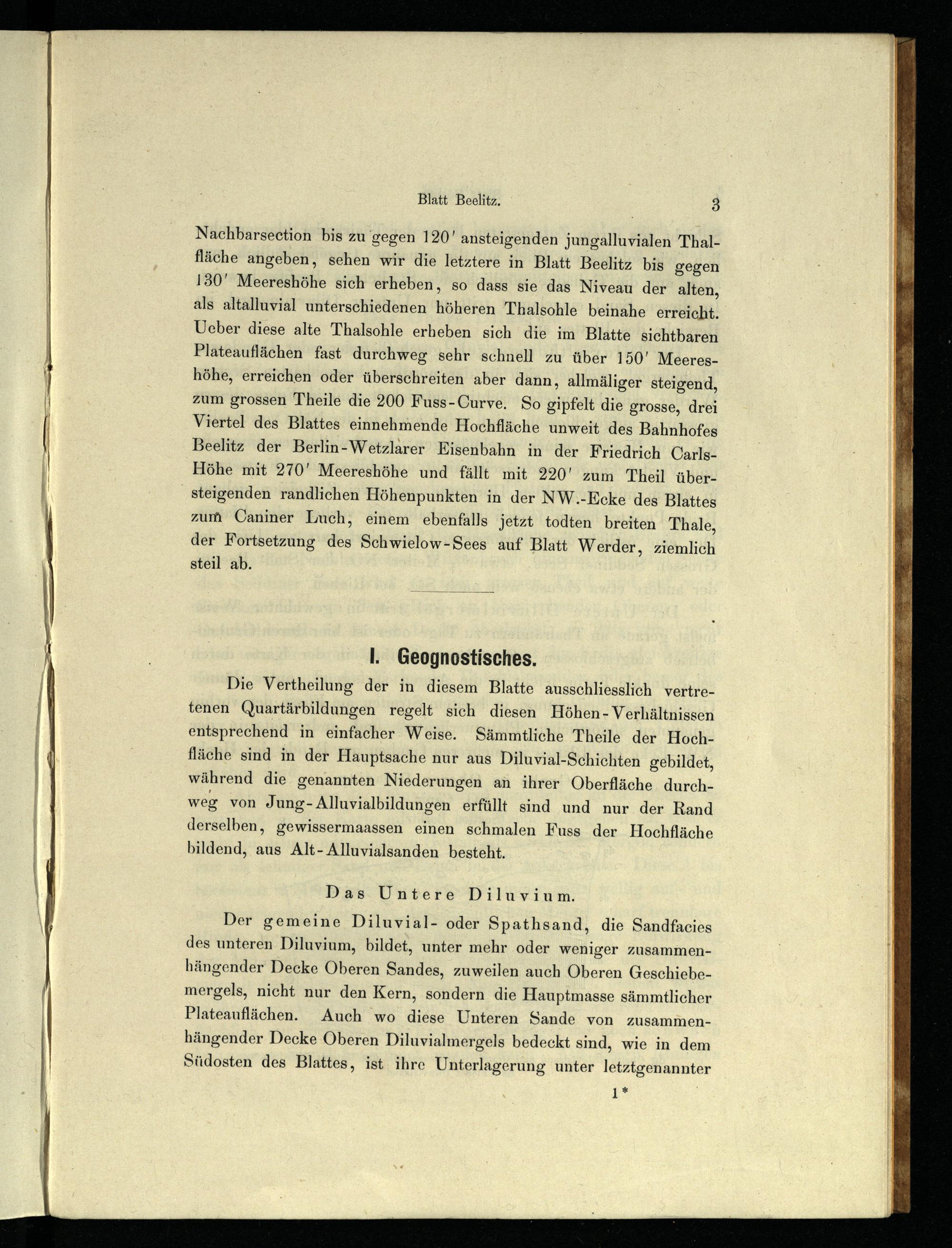 Der gemeine Diluvial- oder Spathsand, die Sandfacies des unteren Diluvium, bildet, unter mehr oder weniger zusammenhängender Decke Oberen Sandes, zuweilen auch Oberen Geschiebemergels, nicht nur den Kern, sondern die Hauptmasse sämmtlicher Plateauflächen. Auch wo diese Unteren Sande von zusammenhängender Decke Oberen Diluvialmergels bedeckt sind, wie in dem Südosten des Blattes, ist ihre Unterlagerung unter letztgenannter