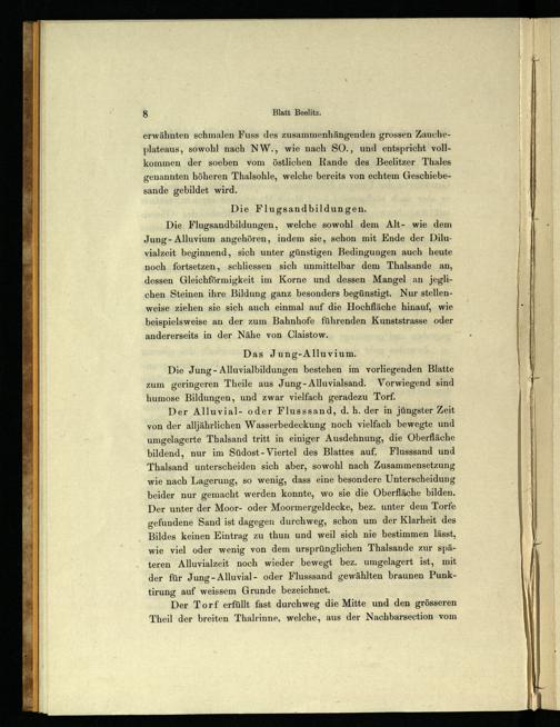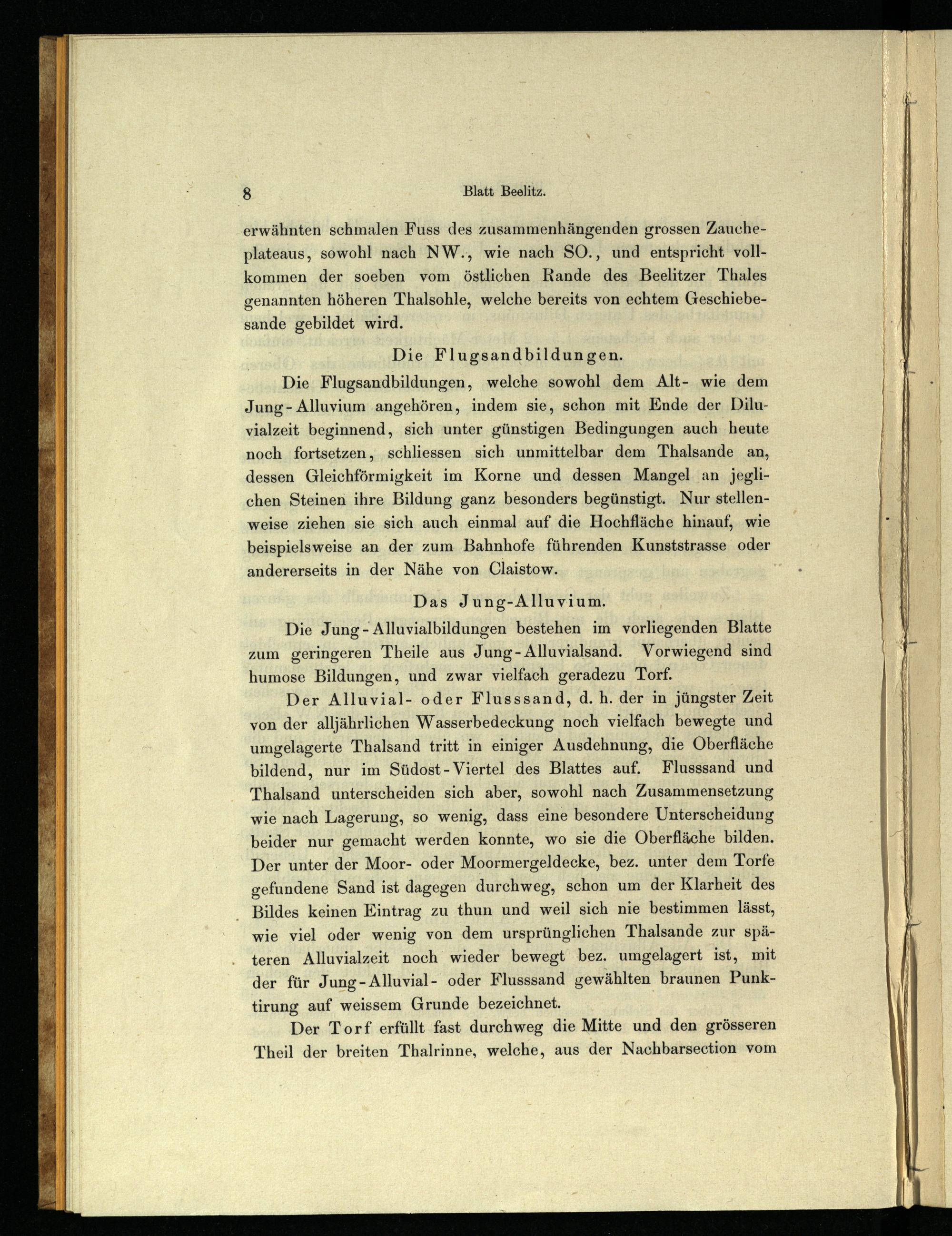 Die Flugsandbildungen, welche sowohl dem Alt- wie dem Jung- Alluvium angehören, indem sie, schon mit Ende der Diluvialzeit beginnend, sich unter günstigen Bedingungen auch heute noch fortsetzen, schliessen sich unmittelbar dem Thalsande an, dessen Gleichförmigkeit im Korne und dessen Mangel an jeglichen Steinen ihre Bildung ganz besonders begünstigt. Nur stellenweise ziehen sie sich auch einmal auf die Hochfläche hinauf, wie beispielsweise an der zum Bahnhofe führenden Kunststrasse oder andererseits in der Nähe von Claistow.