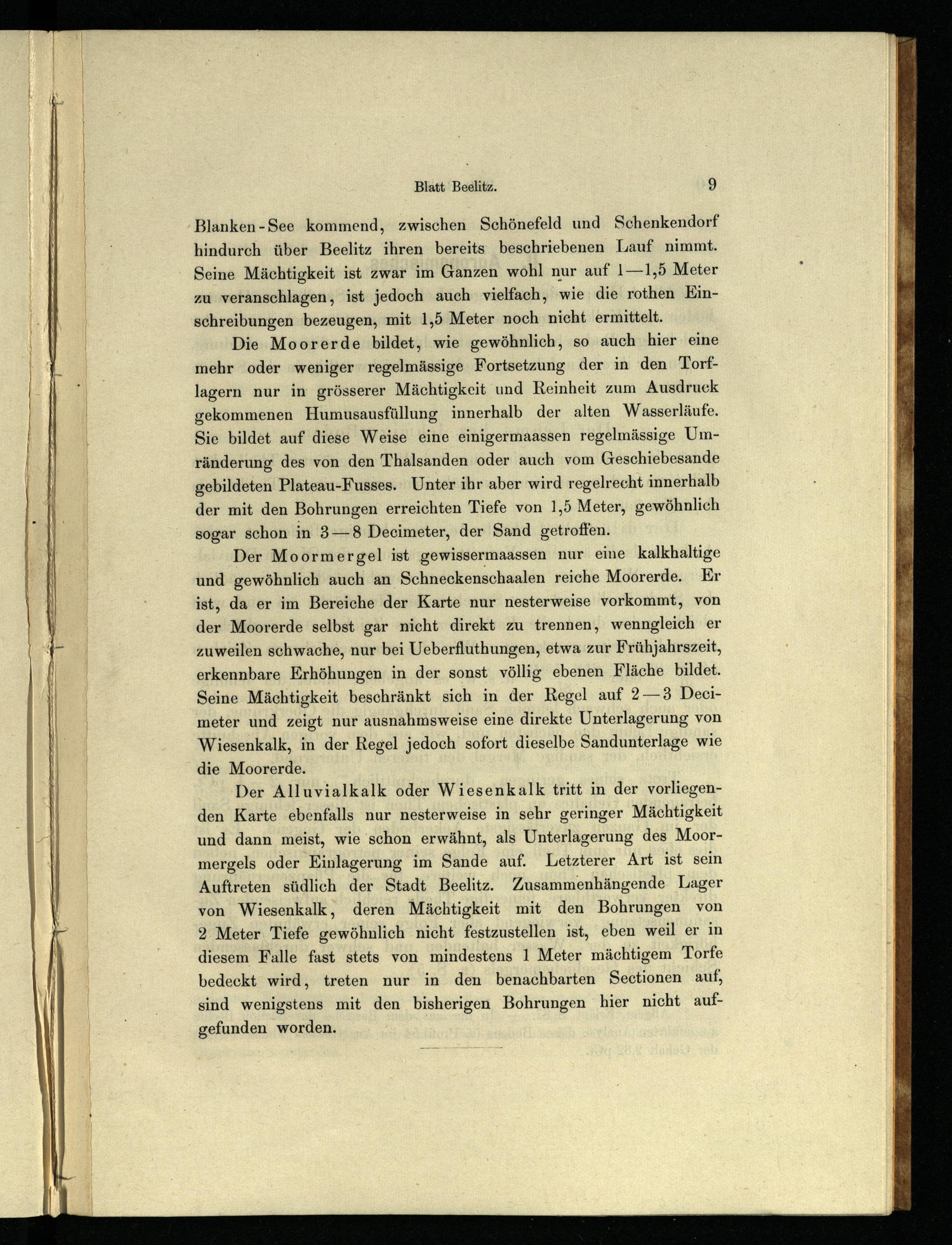 Der Alluvialkalk oder Wiesenkalk tritt in der vorliegenden Karte ebenfalls nur nesterweise in sehr geringer Mächtigkeit und dann meist, wie schon erwähnt, als Unterlagerung des Moormergels oder Einlagerung im Sande auf. Letzterer Art ist sein Auftreten südlich der Stadt Beelitz. Zusammenhängende Lager von Wiesenkalk, deren Mächtigkeit mit den Bohrungen von 2 Meter Tiefe gewöhnlich nicht festzustellen ist, eben weil er in diesem Falle fast stets von mindestens 1 Meter mächtigem Torfe bedeckt wird, treten nur in den benachbarten Sectionen auf, sind wenigstens mit den bisherigen Bohrungen hier nicht aufgefunden worden.