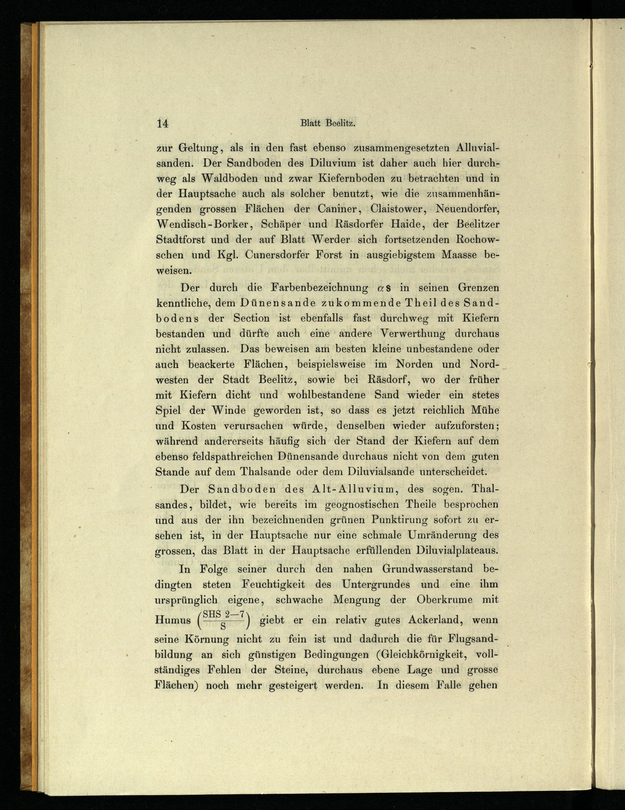 zur Geltung, als in den fast ebenso zusammengesetzten Alluvialsanden. Der Sandboden des Diluvium ist daher auch hier durchweg als Waldboden und zwar Kiefernboden zu‘ betrachten und in der Hauptsache auch als solcher benutzt, wie die zusammenhängenden grossen Flächen der Caniner, Claistower, Neuendorfer, Wendisch-Borker, Schäper und Räsdorfer Haide, der Beelitzer Stadtforst und der auf Blatt Werder. sich fortsetzenden Rochowschen und Kgl. Cunersdorfer Forst in ausgiebigstem Maasse beweisen.