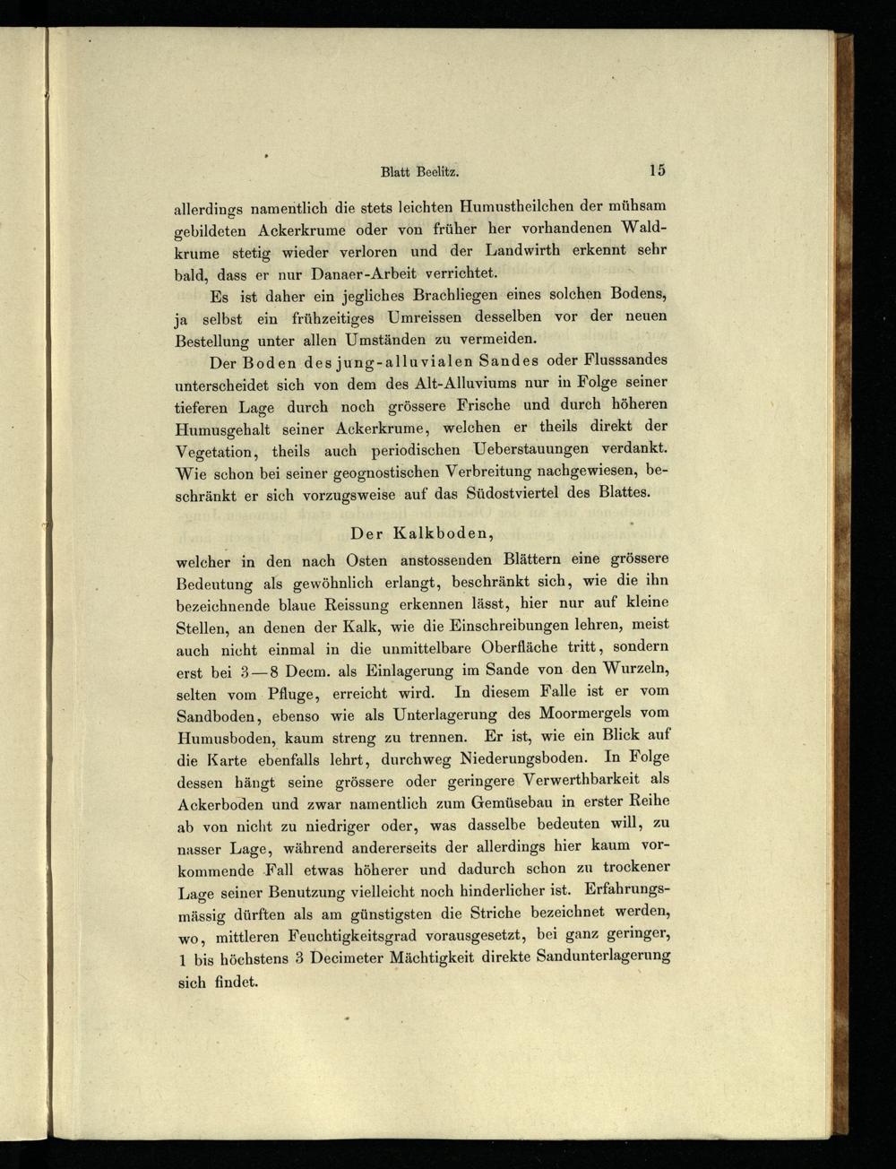 welcher in den nach Osten anstossenden Blättern eine grössere Bedeutung als gewöhnlich erlangt, beschränkt sich, wie die ihn bezeichnende blaue Reissung erkennen lässt, hier nur auf kleine Stellen, an denen der Kalk, wie die Einschreibungen lehren, meist auch nicht einmal in die unmittelbare Oberfläche tritt, sondern erst bei 3—8 Decm. als Einlagerung im Sande von den Wurzeln, selten vom. Pfluge, erreicht wird. In diesem Falle ist er vom Sandboden, ebenso wie als Unterlagerung des Moormergels vom Humusboden, kaum streng zu trennen. Er ist, wie ein Blick auf die Karte ebenfalls lehrt, durchweg Niederungsboden. In Folge dessen hängt seine grössere oder geringere, Verwerthbarkeit als Ackerboden und zwar namentlich zum Gemüsebau in erster Reihe ab von nicht zu niedriger oder, was dasselbe bedeuten will, zu nasser Lage, während andererseits der allerdings hier kaum vorkommende ‚Fall etwas höherer und dadurch schon zu trockener Lage seiner Benutzung vielleicht noch hinderlicher ist. Erfahrungsmässig dürften als am günstigsten die Striche bezeichnet werden, wo, mittleren Feuchtigkeitsgrad vorausgesetzt, bei ganz geringer, 1 bis höchstens 3 Decimeter Mächtigkeit direkte Sandunterlagerung sich findet.