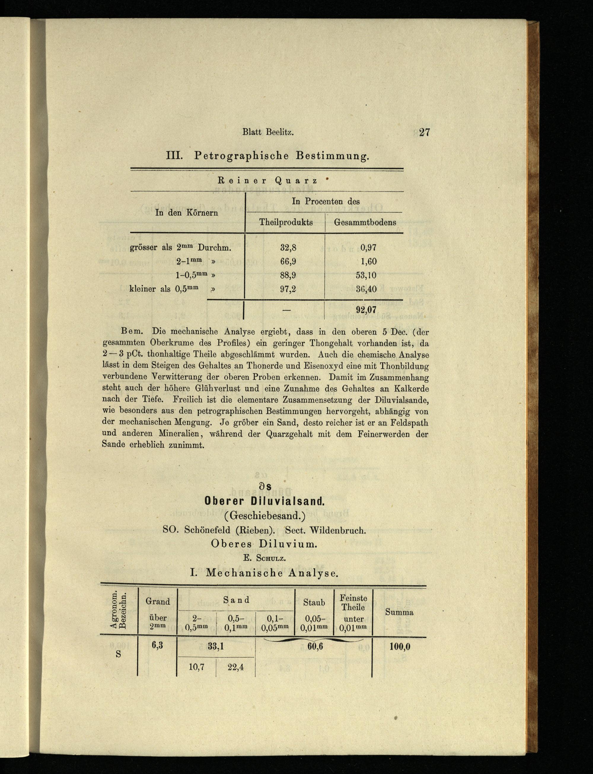 Bem. Die mechanische Analyse ergiebt, dass in den oberen 5 Dee.(der gesammten Oberkrume des Profiles) ein geringer Thongehalt vorhanden ist, da 2—3 pCt. thonhaltige Theile abgeschlämmt wurden. Auch die chemische Analyse lässt in dem Steigen des Gehaltes an Thonerde und Eisenoxyd eine mit Thonbildung verbundene Verwitterung der oberen Proben erkennen. Damit im Zusammenhang steht auch der höhere Glühverlust und eine Zunahme des Gehaltes an Kalkerde nach der Tiefe. Freilich ist die elementare Zusammensetzung der Diluvialsande, wie besonders aus den petrographischen Bestimmungen hervorgeht, abhängig von der mechanischen Mengung. Je gröber ein Sand, desto reicher ist er an Feldspath und anderen Mineralien, während der Quarzgehalt mit dem Feinerwerden der Sande erheblich zunimmt.