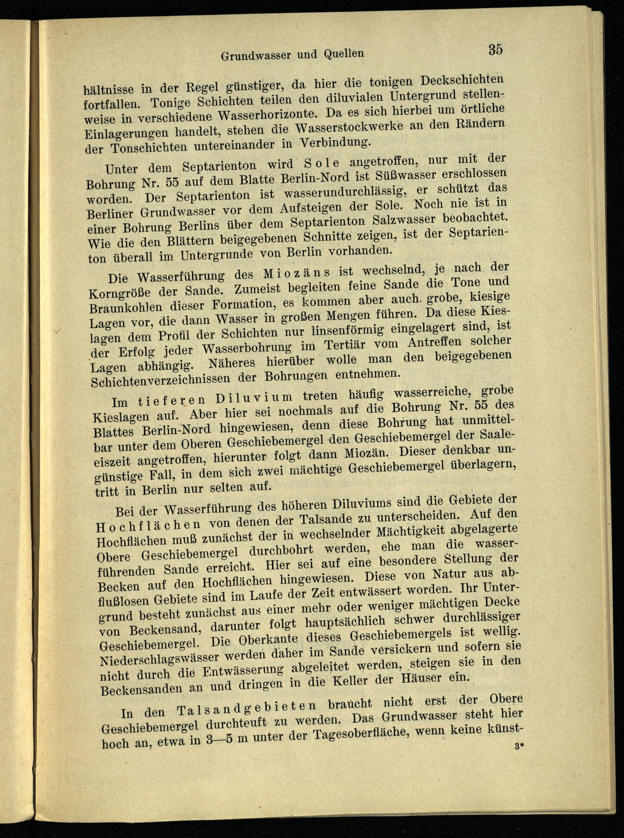Unter dem Septarienton wird Sole angetroffen, nur mit der Bohrung Nr. 55 auf dem Blatte Berlin-Nord ist Süßwasser erschlossen worden. Der Septarienton ist wasserundurchlässig, er schützt das Berliner Grundwasser vor dem Aufsteigen der Sole. Noch nie ist in einer Bohrung Berlins über dem Septarienton Salzwasser beobachtet. Wie die den Blättern beigegebenen Schnitte zeigen, ist der Septarienton überall im Untergrunde von Berlin vorhanden.