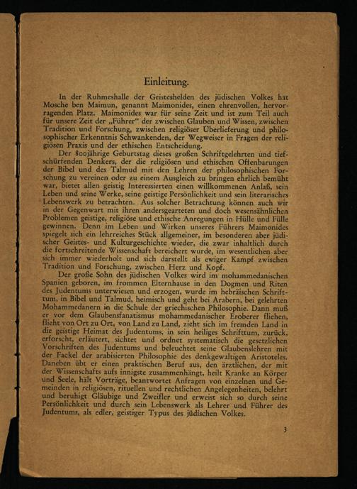 Der 800jährige Geburtstag dieses großen Schriftgelehrten und tiefschürfenden Denkers, der die religiösen und ethischen Offenbarungen der Bibel und des Talmud mit den Lehren der philosophischen Forschung zu vereinen oder zu einem Ausgleich zu bringen ehrlich bemüht war, bietet allen geistig Interessierten einen willkommenen Anlaß, sein Leben und seine Werke, seine geistige Persönlichkeit und sein literarisches Lebenswerk zu betrachten. Aus solcher Betrachtung können auch wir in der Gegenwart mit ihren andersgearteten und doch wesensähnlichen Problemen geistige, religiöse und ethische Anregungen in Hülle und Fülle gewinnen. Denn im Leben und Wirken unseres Führers Maimonides spiegelt sich ein lehrreiches Stück allgemeiner, im besonderen aber jüdischer Geistes- und Kulturgeschichte wieder, die zwar inhaltlich durch die fortschreitende Wissenschaft bereichert wurde, im wesentlichen aber sich immer wiederholt und sich darstellt als ewiger Kampf zwischen Tradition und Forschung, zwischen Herz und Kopf.