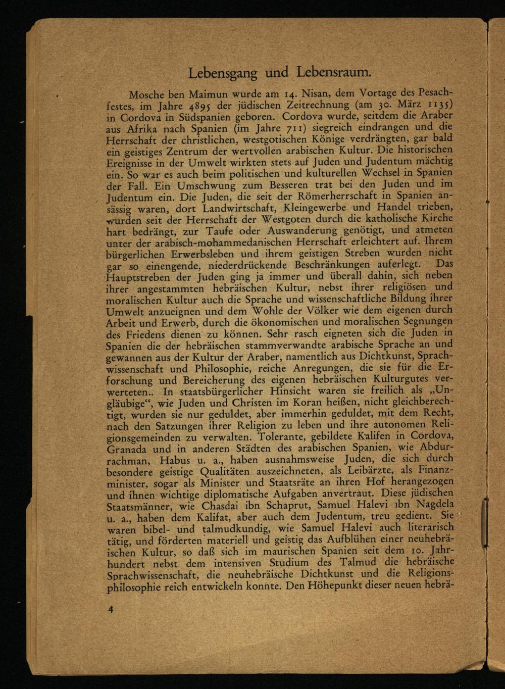 Mosche ben Maimun wurde am 14. Nisan, dem Vortage des Pesach- festes, im Jahre 4895 der jüdischen Zeitrechnung (am 30. März 1135) in Cordova in Südspanien geboren. Cordova wurde, seitdem die Araber aus Afrika nach Spanien (im Jahre 711) siegreich eindrangen und die Herrschaft der christlichen, westgotischen Könige verdrängten, gar bald ein geistiges Zentrum der wertvollen arabischen Kultur. Die historischen Ereignisse in der Umwelt wirkten stets auf Juden und Judentum mächtig ein. So war es auch beim politischen und kulturellen Wechsel in Spanien der Fall. Ein Umschwung zum Besseren trat bei den Juden und im Judentum ein. Die Juden, die seit der Römerherrschaft in Spanien ansässig waren, dort Landwirtschaft, Kleingewerbe und Handel trieben, wurden seit der Herrschaft der Westgoten durch die katholische Kirche hart bedrängt, zur Taufe oder Auswanderung genötigt, und atmeten unter der arabisch-mohammedanischen Herrschaft erleichtert auf. Ihrem bürgerlichen Erwerbsleben und ihrem geistigen Streben wurden nicht gar so einengende, niederdrückende Beschränkungen auferlegt. Das Hauptstreben der Juden ging ja immer und überall dahin, sich neben ihrer angestammten hebräischen Kultur, nebst ihrer religiösen und moralischen Kultur auch die Sprache und wissenschaftliche Bildung ihrer Umwelt anzueignen und dem Wohle der Völker wie dem eigenen durch Arbeit und Erwerb, durch die ökonomischen und moralischen Segnungen des Friedens dienen zu können. Sehr rasch eigneten sich die Juden in Spanien die der hebräischen stammverwandte arabische Sprache an und gewannen aus der Kultur der Araber, namentlich aus Dichtkunst, Sprachwissenschaft und Philosophie, reiche Anregungen, die sie für die Erforschung und Bereicherung des eigenen hebräischen Kulturgutes verwerteten.. In staatsbürgerlicher Hinsicht waren sie freilich als „Ungläubige“, wie Juden und Christen im Koran heißen, nicht gleichberechtigt, Wurden sie nur geduldet, aber immerhin geduldet, mit dem Recht, nach den Satzungen ihrer Religion zu leben und ihre autonomen Religionsgemeinden zu verwalten. Tolerante, gebildete Kalifen in Cordova, Granada und in anderen Städten des arabischen Spanien, wie Abdur- rachman, Habus u. a., haben ausnahmsweise Juden, die sich durch besondere geistige Qualitäten auszeichneten, als Leibärzte, als Finanzminister, sogar als Minister und Staatsräte an ihren Hof herangezogen und ihnen wichtige diplomatische Aufgaben anvertraut. Diese jüdischen Staatsmänner, wie Chasdai ibn Schaprut, Samuel Halevi ihn Nagdela u. a., haben dem Kalifat, aber auch dem Judentum, treu gedient. Sie waren bibel- und talmudkundig, wie Samuel Halevi auch literarisch tätig, und förderten materiell und geistig das Aufblühen einer neuhebräischen Kultur, so daß sich im maurischen Spanien seit dem 10. Jahrhundert nebst dem intensiven Studium des Talmud die hebräische Sprachwissenschaft, die neuhebräische Dichtkunst und die Religionsphilosophie reich entwickeln konnte. Den Höhepunkt dieser neuen hebrä-