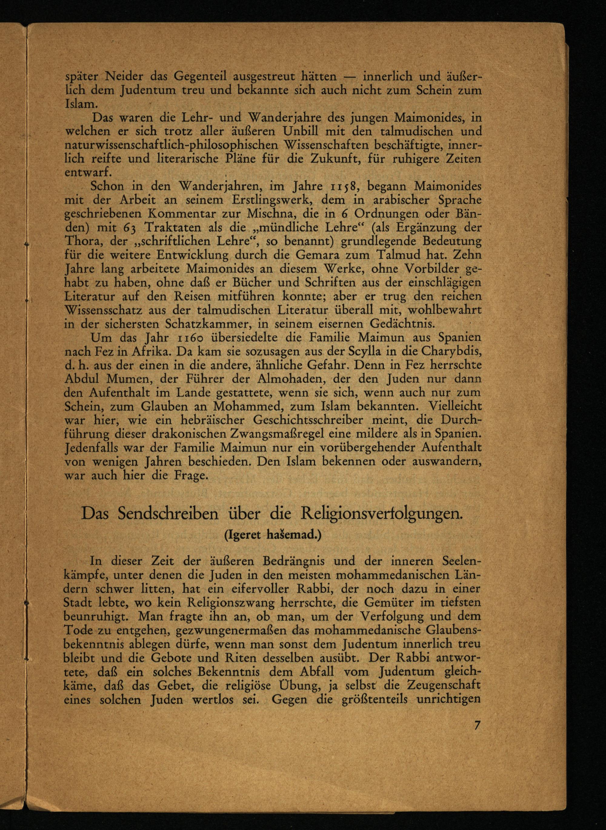 Das waren die Lehr- und Wanderjahre des jungen Maimonides, in welchen er sich trotz aller äußeren Unbill mit den talmudischen und naturwissenschaftlich-philosophischen Wissenschaften beschäftigte, innerlich reifte und literarische Pläne für die Zukunft, für ruhigere Zeiten entwarf.