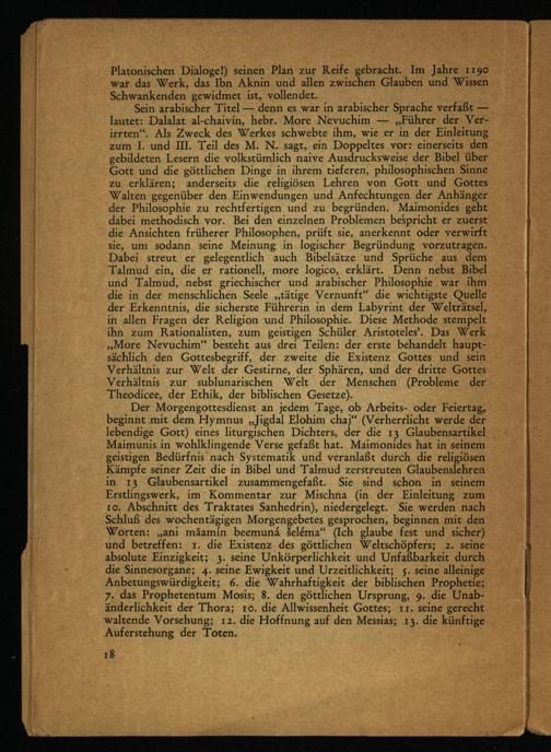Der Morgengottesdienst an jedem Tage, ob Arbeits- oder Feiertag, beginnt mit dem Hymnus „Jigdal Elohim chaj“ (Verherrlicht werde der lebendige Gott) eines liturgischen Dichters, der die 13 Glaubensartikel Maimunis in wohlklingende Verse gefaßt hat. Maimonides hat in seinem geistigen Bedürfnis nach Systematik und veranlaßt durch die religiösen Kämpfe seiner Zeit die in Bibel und Talmud zerstreuten Glaubenslehren in 13 Glaubensartikel zusammengefaßt. Sie sind schon in seinem Erstlingswerk, im Kommentar zur Mischna (in der Einleitung zum 10. Abschnitt des Traktates Sanhedrin), niedergelegt. Sie werden nach Schluß des wochentägigen Morgengebetes gesprochen, beginnen mit den Worten: „ani mäamm beemuna Selema“ (Ich glaube fest und sicher) und betreffen: 1. die Existenz des göttlichen Weltschöpfers; 2. seine absolute Einzigkeit; 3. seine Unkörperlichkeit und Unfaßbarkeit durch die Sinnesorgane; 4. seine Ewigkeit und Urzeitlichkeit; j. seine alleinige Anbetungswürdigkeit; 6 . die Wahrhaftigkeit der biblischen Prophetie; 7. das Prophetentum Mosis; 8. den göttlichen Ursprung, 9. die Unabänderlichkeit der Thora; 10. die Allwissenheit Gottes; 11. seine gerecht waltende Vorsehung; 12. die Hoffnung auf den Messias; 13. die künftige Auferstehung der Toten.