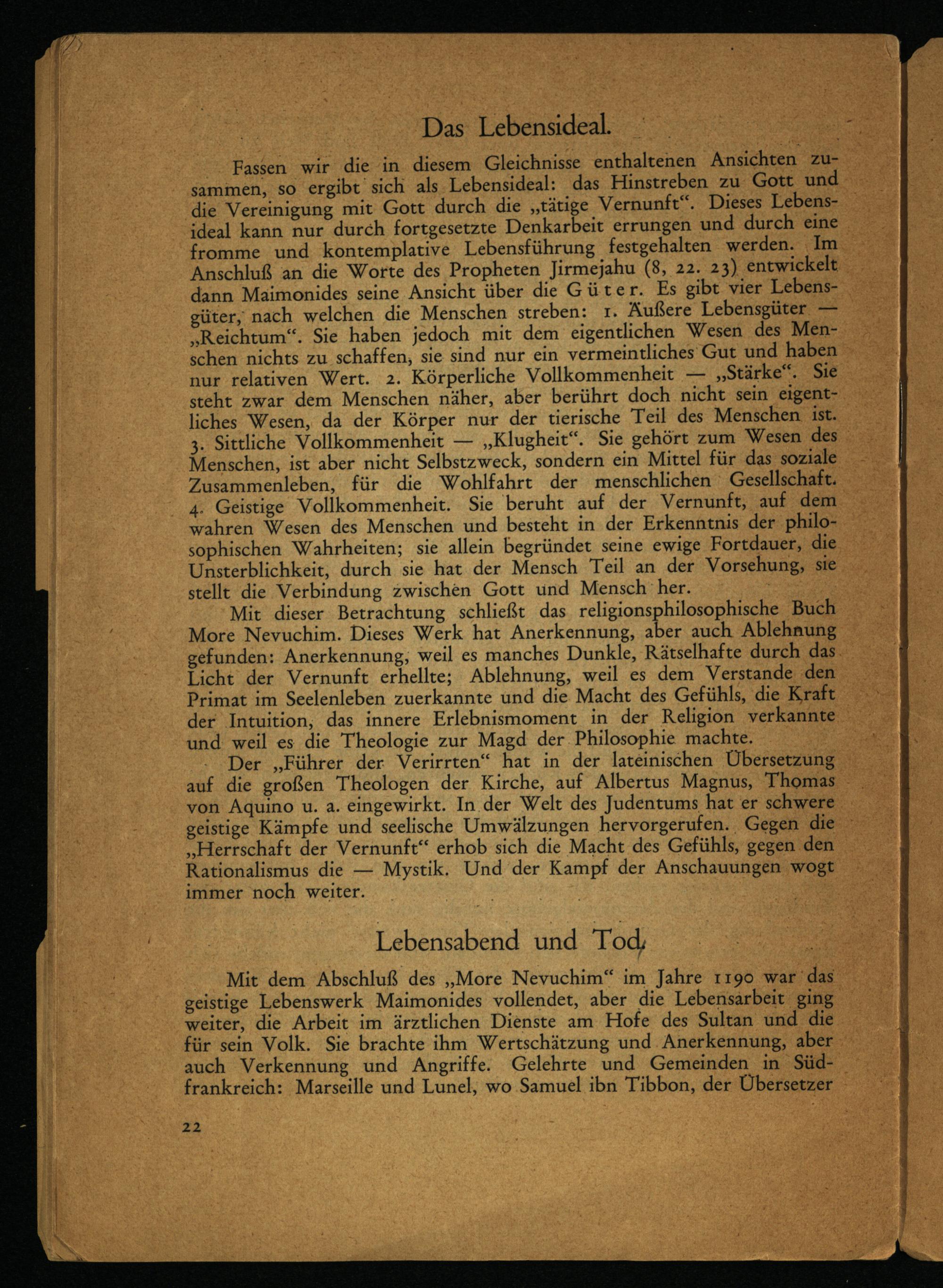 Fassen wir die in diesem Gleichnisse enthaltenen Ansichten zusammen, so ergibt sich als Lebensideal: das Hinstreben zu Gott und die Vereinigung mit Gott durch die „tätige Vernunft“. Dieses Lebensideal kann nur durch fortgesetzte Denkarbeit errungen und durch eine fromme und kontemplative Lebensführung festgehalten werden. Im Anschluß an die Worte des Propheten Jirmejahu (8, 22. 23) entwickelt dann Maimonides seine Ansicht über die Güter. Es gibt vier Lebensgüter, nach welchen die Menschen streben: 1. Äußere Lebensgüter — „Reichtum“. Sie haben jedoch mit dem eigentlichen Wesen des Menschen nichts zu schaffen, sie sind nur ein vermeintliches Gut und haben nur relativen Wert. 2. Körperliche Vollkommenheit — „Stärke“. Sie steht zwar dem Menschen näher, aber berührt doch nicht sein eigentliches Wesen, da der Körper nur der tierische Teil des Menschen ist.
