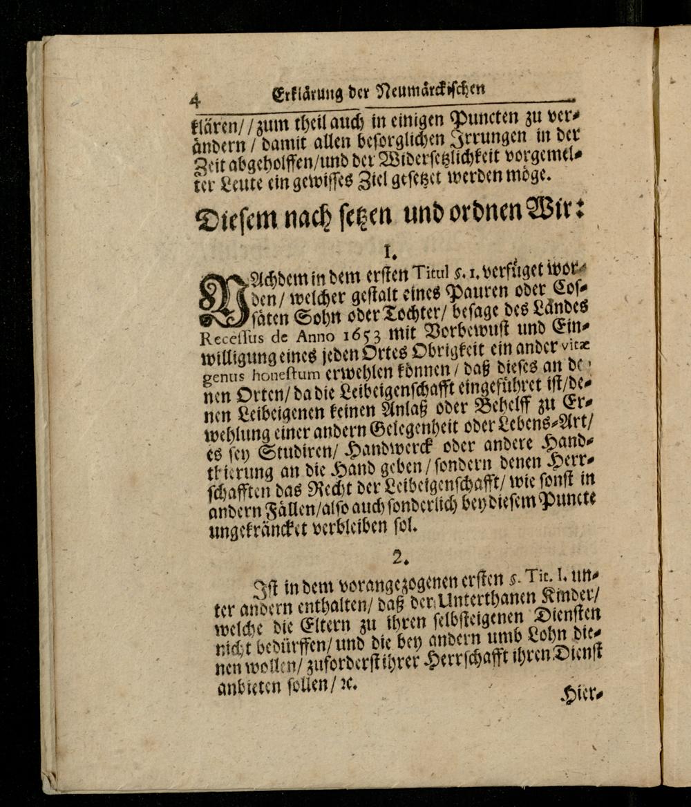 ſaͤten Sohn oder Tochter/ beſage des Laͤndes Receſſus de Anno 1653 mit Vorbewuſt und Einwilligung eines jeden Ortes Obrigkeit ein ander vitz genus honeſtum erwehlen konnen/ daß dieſes an de nen Orten/ da die Leibeigenſchafft eingeführet iſt/ denen Leibeigenen keinen Anlaß oder Behelff zu Erwehlung einer andern Gelegenheit oder Lebens⸗Art/ es ſey Studiren/ Handwerck oder andere Handthierung an die Hand geben/ ſondern denen Herrſchafften das Recht der Leibeigenſchafft/ wie ſonſt in andern Faͤllen/ alſo auch ſonderlich bey dieſem Puncte ungekräncket verbleiben ſol.