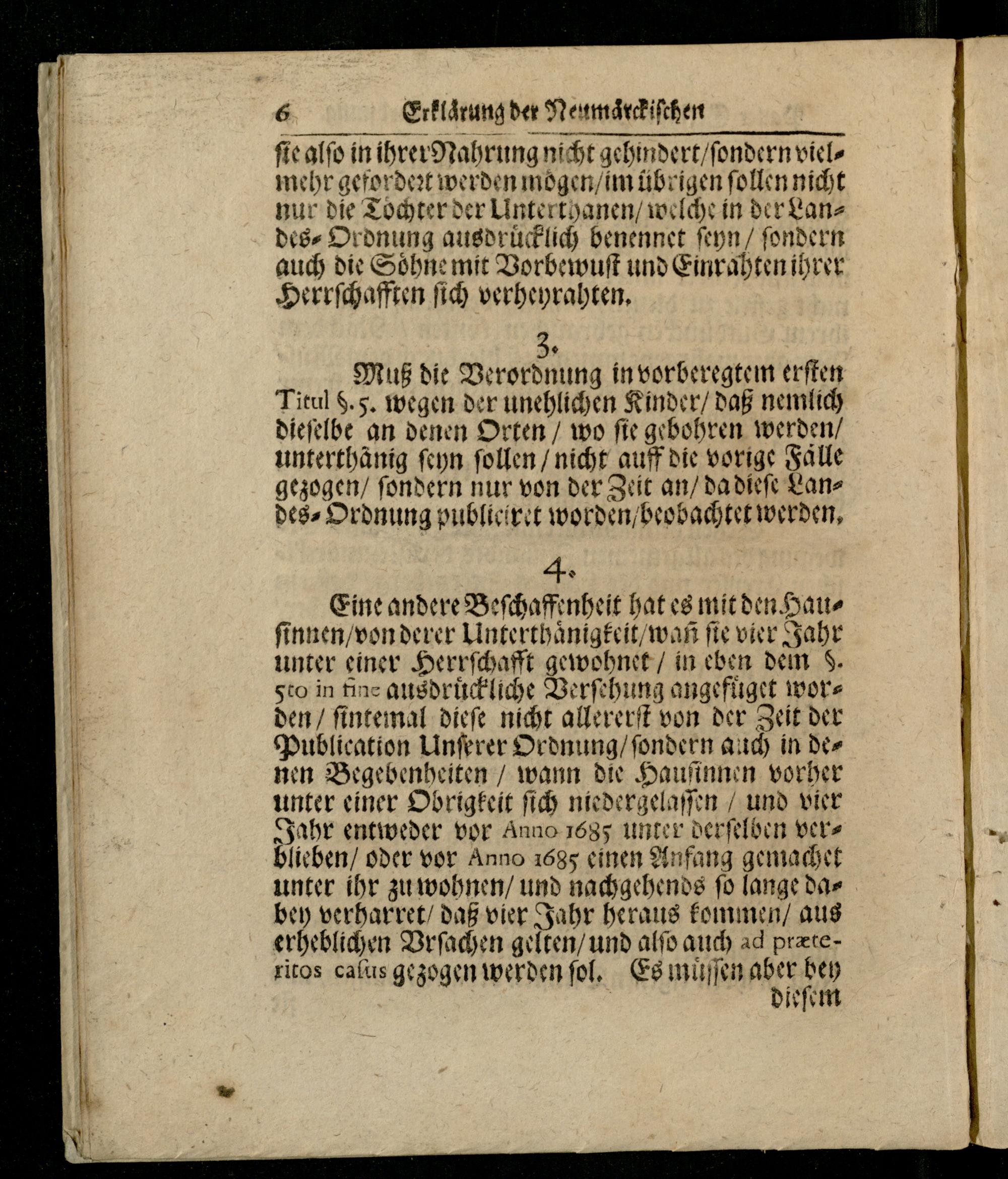 Eine andere Beſchaffenheit hat es mit den Hauſinnen/ von derer Unterthaͤnigkeit/ wañ ſie vier Jahr unter einer Herrſchafft gewohnet/ in eben dem 8. 5to in fine ausdruͤckliche Verſehung angefuͤget worden/ ſintemal dieſe nicht allererſt von der Zeit der Publication Unſerer Ordnung/ ſondern auch in denen Begebenheiten/ wann die Hauſinnen vorher unter einer Obrigkeit ſich niedergelaſſen/ und vier Jahr entweder vor Anno 1685 unter derſelben Vers blieben/ oder vor Anno 1685 einen Anfang gemachet unter ihr zu wohnen/ und nachgehends ſo lange dabey verharret/ daß vier Jahr heraus kommen/ aus erheblichen Vrſachen gelten/ und alſo auch ad præteritos caſus gezogen werden fol, Es muͤſſen 47 0