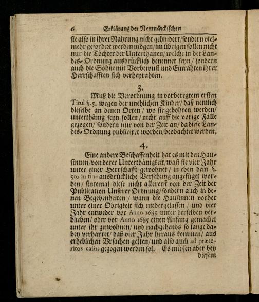3. Muß die Verordnung in vorberegtem erſten Titul 6. 5. wegen der unehlichen Kinder/ daß nemlich dieſelbe an denen Orten/ wo fie gebohren werden/ unterthanig ſeyn ſollen/ nicht auff die vorige Falle gezogen/ ſondern nur von der Zeit an/ da dieſe Landes⸗Ordnung publieiret worden/ beobachtet werden.