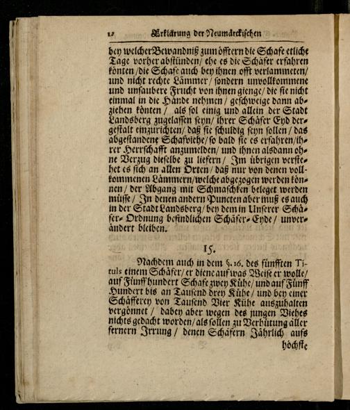 bey welcher Bewandniß zum oͤfftern die Schafe etliche Tage vorher abſtünden/ ehe es die Schäfer erfahren koͤnten/ die Schafe auch bey ihnen offt verlammeten/ und nicht rechte Lammer/ ſondern unvollkommene und unſaubere Frucht von ihnen gienge/ die ſie nicht einmal in die Haͤnde nehmen/ geſchweige dann abziehen koͤnten/ als ſol einig und allein der Stadt Landsberg zugelaſſen ſeyn/ ihrer Schaͤfer Eyd dergeſtalt einzurichten/ daß ſie ſchuldig ſeyn ſollen/ das abgeſtandene Schafpviehe/ ſo bald ſie es erfahren/ ihrer Herrſchafft anzumelden/ und ihnen alsdann ohne Verzug dieſelbe zu liefern/ Im uͤbrigen verſtehet es ſich an allen Orten/ daß nur von denen voll kommenen Laͤmmern/ welche abgezogen werden koͤnnen der Abgang mit Schmaſchken beleget werden muͤſſe/ In denen andern Puncten aber muß es auch in der Stadt Landsberg/ bey dem in Unſerer Schaͤfer“ Ordnung befindlichen Schaͤfer⸗Eyde/ unveraͤndert bleiben.