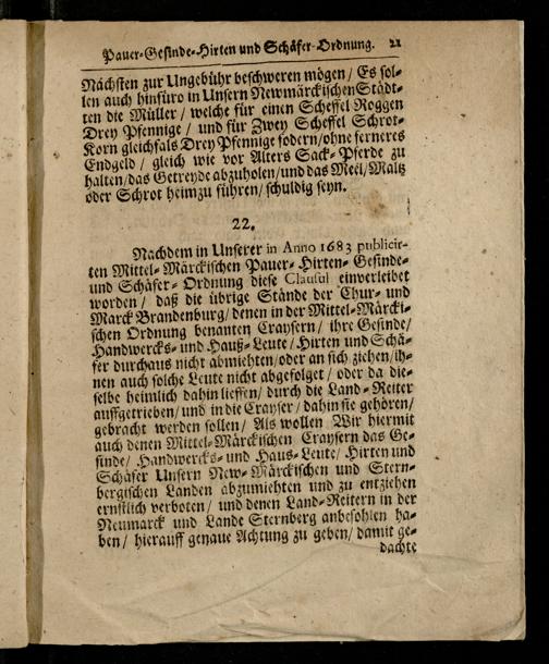 ; 22, Nachdem in Unſerer in Anno 1683 publicitten Mittel⸗Märckiſchen Pauer⸗ Hirten» Geſindeund Schäfer: Ordnung dieſe Clauful einverleibet worden/ daß die uͤbrige Staͤnde der Chur⸗ und Manrck Brandenburg/ denen in der Mittel⸗Maͤrckiſchen Ordnung benanten Crayſern/ ihre Geſinde/ Handwercks⸗ und Hauß⸗Leute/ Hirten und Schãfer durchaus nicht abmiehten/ oder an ſich ziehen ihnen auch ſolche Leute nicht abgefolget, oder da dieſelbe heimlich dahin lieffen/ durch die Lande Reiter auffgetrieben/ und in die Erayſer/ dahin ſie gehoren/ gebracht werden ſollen/ Als wollen Wir hiermit auch denen Mittel⸗Maͤrckiſchen Crayſern das Geſinde/ Handwercks⸗ und Haus⸗ Leute/ Hirten und Schäfer Unſern New⸗ Maͤrckiſchen und Sternbergiſchen Landen abzumiehten und zu entziehen ernſtlich verboten/ und denen Land⸗Reitern in der Neumarck und Lande Sternberg anbeſohlen haben/ hierauff genaue Achtung zu geben/ Sam Sn achte