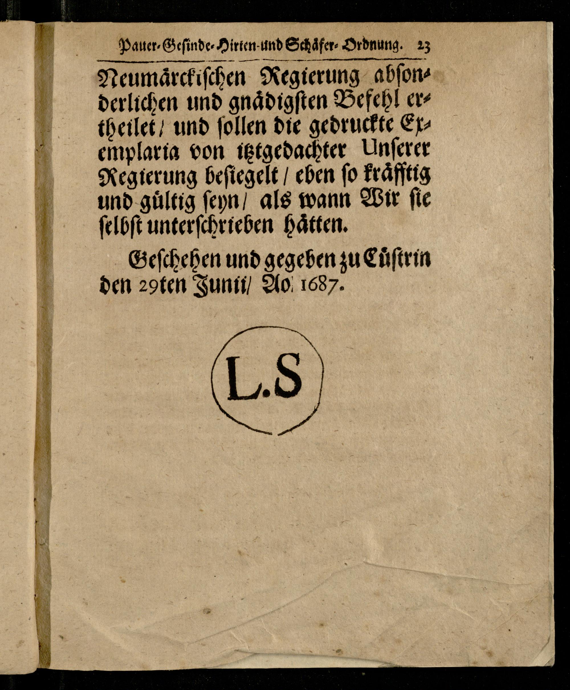 Neumaͤrckiſchen Regierung abſonderlichen und gnaͤdigſten Befehl ertheilet/ und ſollen die gedruckte Exemplaria von itztgedachter Unſerer Regierung beſiegelt/ eben fo kraͤfftig und guͤltig ſeyn/ als wann Wir ſie ſelbſt unterſchrieben Hätten,