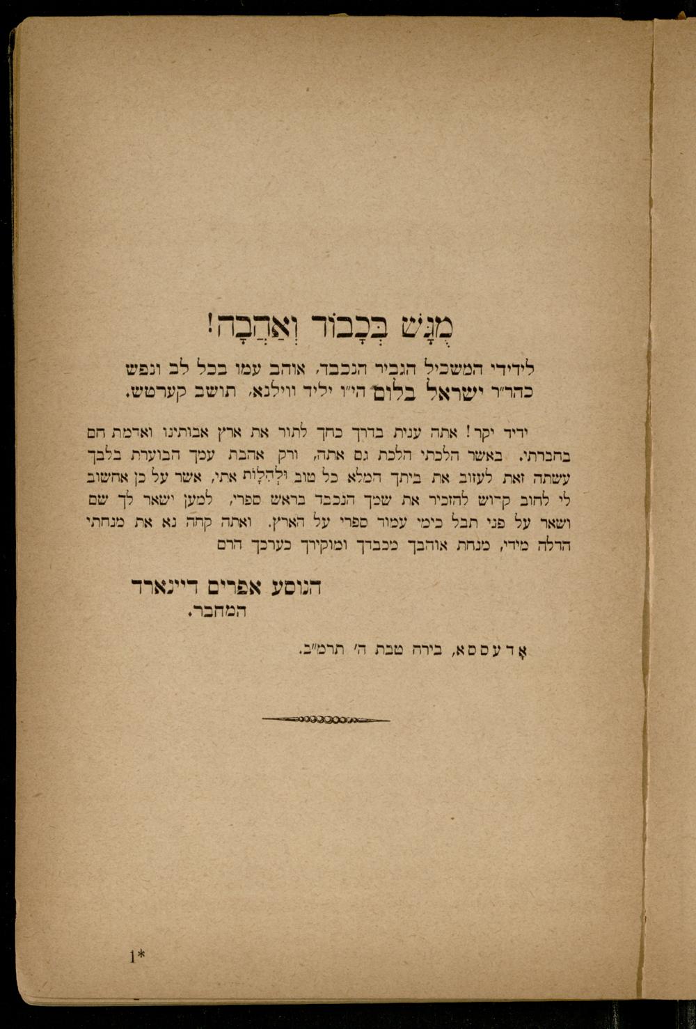 ידיד יקר! אתה ענית בדרך כחך לתור את ארץ אבותינו. ואדמת חם בחברתי. באשר הלכתי הלכת גם אתה, ורק אהבת עכך הבוערת ו עשתה זאת לעזוב. את ביתך המלא כל טוב וּלְהַלָות אתי, אשר על כן אחשוב לי לחוב קדוש להזכיר את שנך הנכבד בראש ספרי, למען ישאר, שם ושאר על פני תבל כימי עמור ספרי על הארץ. ואתה קחה נא את מנחתי הרלה מירי, מנחת אוהבך מכבדך ומוקירך כערכך הרם