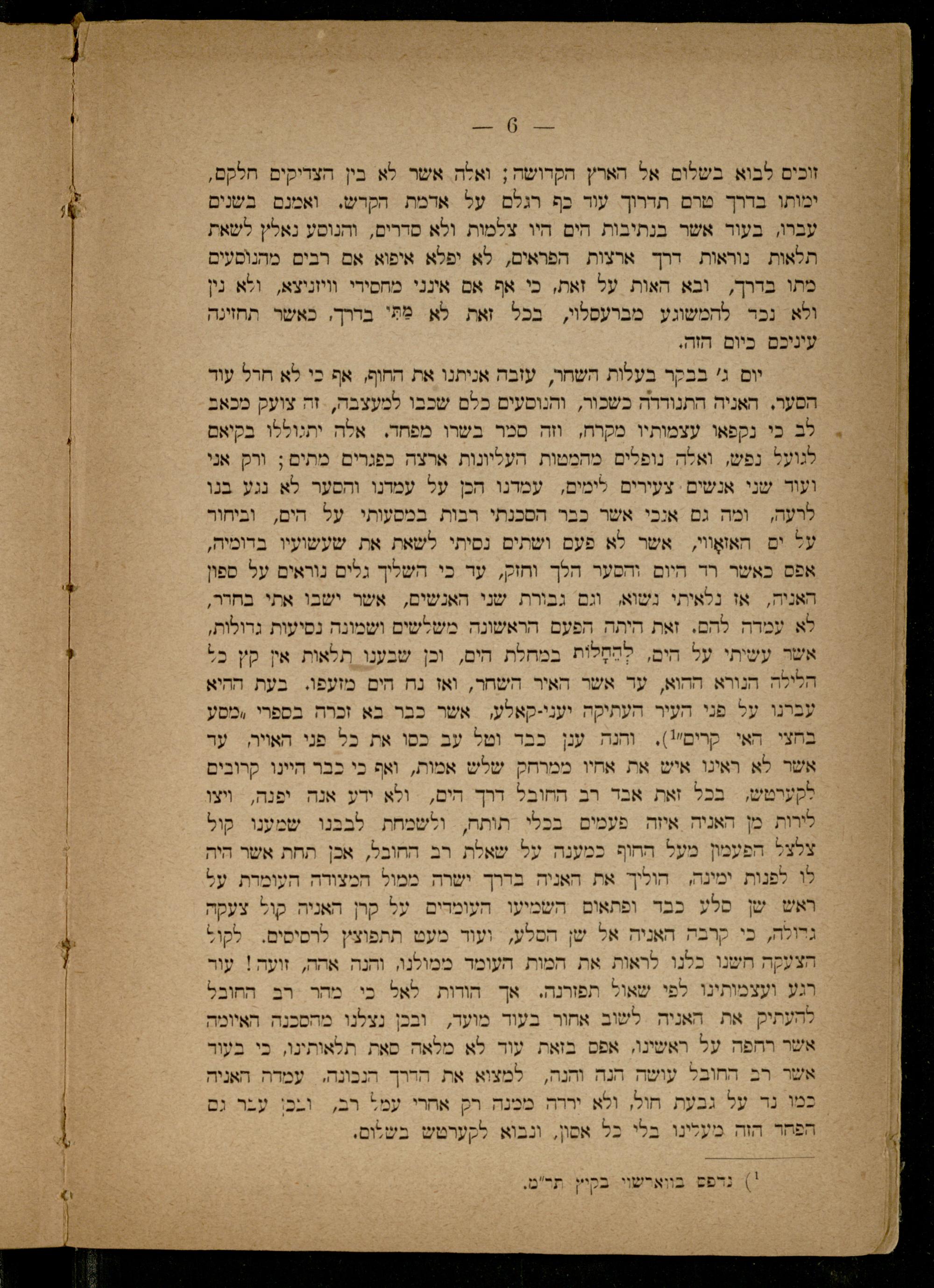 בי ימותו בדרך טרם תדרוך עור כף רגלם על אדמת הקרש. ואמנם בשנים עברו, בעוד אשר בנתיבות הים היו צלמות ולא סדרים, והנוסע נאלץ לשאת תלאות נוראות דרך ארצות הפראים, לא יפלא איפוא. אם רבים מהנוסעים מתו בדרך, ובא האות על זאת, כי אף אם אינני מחסידי וויזניצא, ולא נין ולא נכד להמשוגע מברעסלוי, בכל זאת לא מתִי בדרך, כאשר תחזינה עיניכם כיום הזה.
