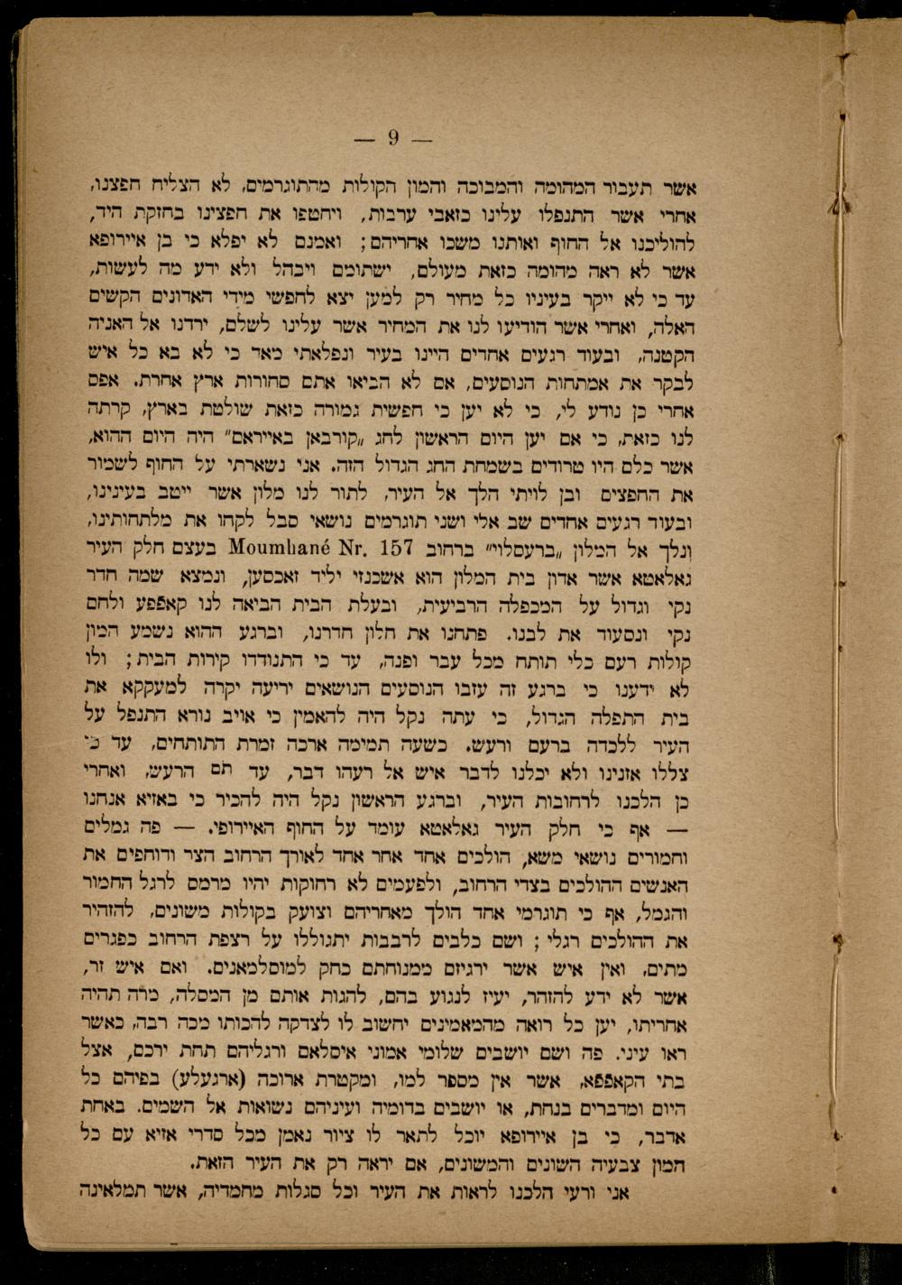 אשר תעבור המהומה והמבוכה והמון הקולות. מהתוגרמים, לא הצליח חפצנו, אחרי אשר התנפלו עלינו כזאבי ערבות, ויחטפו את חפצינו בחזקת היר, להוליכנו אל החוף ואותנו משכו אחריהם; ואמנם לא יפלא כי בן איירופא אשר לא ראה מהומה כזאת מעולם, ישתומם ויבהל ולא ירע מה לעשות, עד כי לא ויקר בעיניו כל מחיר רק למען יצא לחפשי מידי האדונים. הקשים האלה, ואחרי אשר הודיעו לנו את המחיר אשר עלינו לשלם, ירדנו. אל האניה הקטנה, ובעור רגעים אחרים היינו. בעיר ונפלאתי מאר כי לא בא כל איש לבקר את אמתחות הנוסעים, אם לא הביאו אתם מחורות ארץ אחרת. אפס אחרי כן נודע לי, כי לא יען כי חפשית גמורה כואת שולטת בארץ, קרתה לנו כזאת, כי אם וען היום הראשון לחג ,קורבאן באייראם" היה היום ההוא, אשר כלם היו טרודים בשמחת החג הגדול הזה. אני נשארתי על החוף לשמור את החפצים ובן לויתי הלך אל העיר,. לתור לנו מלון אשר ייטב בעינינו, ובעור רגעים אחרים שב אלי ושני תוגרמים נושאי סבל לקחו את מלתחותינו, ונלך אל המלון ,ברעסלוי" ברחוב. 157 ,זא 6חגו!נגו110 בעצם חלק העיר גאלאטא אשר אדון בית המלון הוא אשכנזי יליר זאכסען, ונמצא שמה הרדר נקי וגדול על המכפלה הרביעית, ובעלת הבית הביאה לנו קאפפע ולחם נקי ונסעוד את לבנו. פתתגו את תלון חררנו, וברגע ההוא נשמע הבון קולות רעם כלי תותח מכל עבר ופנה, עד כי התנודרו קירות הבית; ולו לא ידענו כי ברגע זה עזבו הנוסעים הנושאים יריעה יקרה למעקקא את בית. התפלה הגדול, בי עתה. נקל היה להאמין כי אויב נורא התנפל על העיר ללכדה ברעם ורעש. כשעה תמימה ארכה זמרת התותחים, עד כי צללו אזנינו ולא יכלנו לדבר איש אל רעהו דבר, עד תם הרעש, ואחרי כן הלכנו לרחובות העיר, וברגע הראשון נקל היה להכיר כי באזיא אנחנו -- אף כי חלק העיר גאלאטא עומד על החוף האיירופי.-- פה גמלים וחמורים נושאי משא, הולכים אחד אחר אחד לאורך הרחוב הצר ודוחפים את האנשים ההולכים בצרי הרחוב, ולפעמים לא רחוקות יהיו מרמס לרגל החמור והגמל, אף כי תוגרמי אחד הולך מאחריהם וצועק בקולות משונים, להזהיר את ההולכים רגלי; ושם כלבים לרבבות יתגוללו על רצפת הרחוב כפגרים מתים,. ואין איש אשר ירגיום ממנוחתם כחק למוסלכאנים. ואם איש זר, אשר לא ירע להזהר, יעיז לנגוע בהם, להגות אותם מן המסלה, פרה תהיה אחריתו, יען כל רואה מהמאמינים יחשוב לו לצדקה להכותו ניכה רבה, כאשר ראו עיני. פה ושם יושבים שלומי אמוני איסלאם ורגליהם תחת ירכם, אצל בתי הקאפפא, אשר אין מספר למו, ומקטרת ארוכה(ארגעלע) בפיהם בל היום ומדברים בנחת, או יושבים בדומיה ועיניהם נשואות אל השמים. באחת אדבר, כי בן איירופא. יוכל לתאר לו ציור נאמן מכל סדרי אזיא עם כל חמון צבעיה השונים והמשונים, אם יראה רק את העיר הואת,