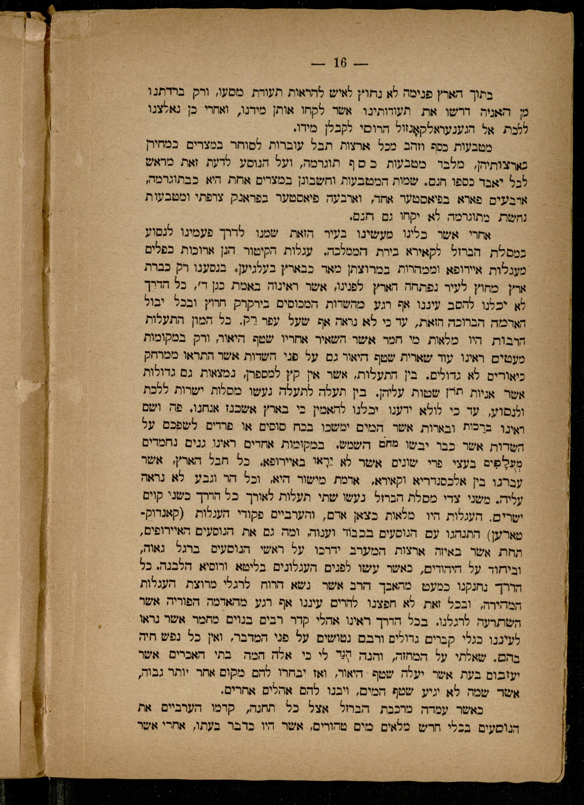 אחרי אשו כלנו מעשינו בעיר הואת שמנו לררך פעמינו לנסוע במסלת הברזל לקאירא בירת. הממלכה.. ענלות הקיטור. הנן ארוכות. כפלים מעגלות איירופא וממהרות במרוצתן מאד כבארץ בעלגיען. בנסענו רק כברת ארץ. מחוץ לעיר נפתחה הארץ לפנינו, אשר ראינוה באמת כגן ד', בל הדרך לא יכלנו להסב עיננו אף רגע מהשרות המכוסים בירקרק חרוץ ובכל יבול הארמה הברוכה הואת, עד כי לא נראה אף שעל עפר רֶק. כל המון התעלות הרבות היו מלאות מי חמר אשר השאיר אחריו שטף היאור, ורק במקומות מעטים ראינו עור שארית שטף היאור גם. על פני השרות אשר התראו ממרחק כואורים לא גדולים. בין התעלות, אשר אין קץ למספרן, נמצאות גם גדולות אשר אניות תרז שטות עליהן. בין תעלה לתעלה נעשו מסלות ישרות ללבת ולנסוע, עד כי לולא ירענו יבלנו להאמין בי בארץ אשכנז אנתנו, פה ושם ואינו. ברכות ובארות. אשר. המים ימשכו בכח סופים או פררים. לשפכם על השרות אשר כבר יבשו מחם השמש. במקומות אחדים ראינו גנים נחמדים מעלְפִים בעצי. פרי שונים אשר לא יַרָאו באיירופא. כל חבל הארץ, אשר עברכו בין אלבסנדריא וקאירא,| אדמת מישור היא, וכל הר וגבע לא נראה עליה. משני צדי מסלת הברול נעשו שתי תעלות לאורך. כל הררך כשני קוים ישרים. העגלות היו מלאות בצאן אדם, והערביים פקורי.(קאנדוקטארען) התנהגו עם הנוסעים בכבור וענוה, ומה. גם את הנוסעים האיירופים, תחת אשר באיוה ארצות המערב ידרכו על ראשי הנוסעים ברגל גאוה, וביחוד על היהודים, כאשר עשו לפנים העגלונים בליטא ורוסיא הלבנה. כל הררך נחנקנו כמעט מהאבך הרב אשר נשא הרוח לרגלי מרוצת העגלות המהירה, ובכל זאת לא חפצנו להרים עיננו אף רגע מהאדמה הפוריה. אשר השתרעה לרגלנו.. בכל הררך ראינו אהלי קדר רבים בנוים. מחמר אשר נראו לעיננו כגלי. קברים גרולים ורבם נטושים על פני המרבר, ואין כל נפש היה בהם. שאלתי על המחזה, והנה הְגד לי כי אלה המה בתי האכרים אשר יעזבום בעת אשר יעלה שטף היאור, ואז יבחרו להם מקום אחר יותר גבוה, אשר שמה לא יגיע שטף המים, ויבנו להם אהלים אחרים.