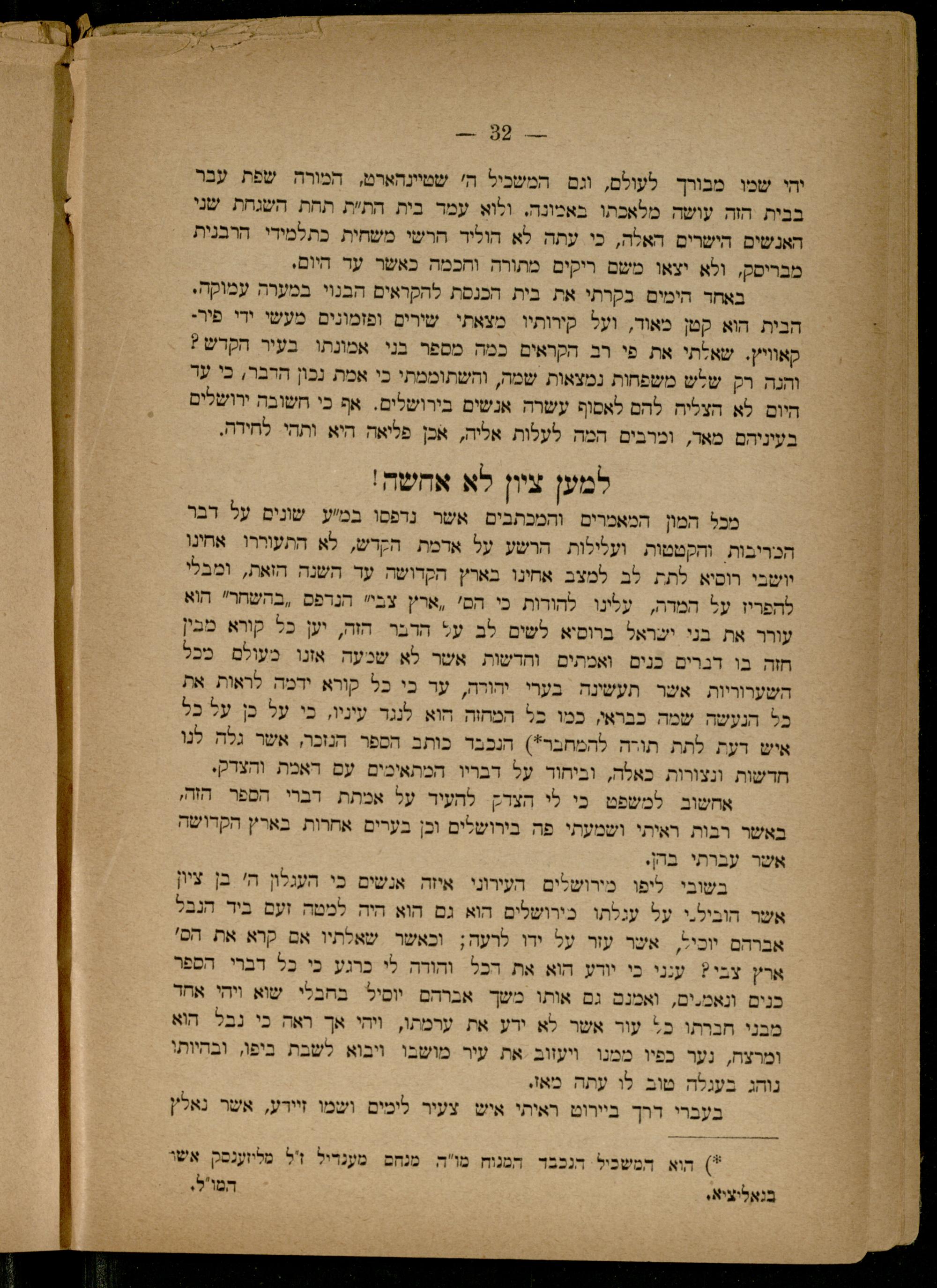 למען ציון לא אחשה! מכל המון המאמרים. והמכתבים אשר נדפסו במיע שונים על דבר הבריבות. והקטטות. ועלילות הרשע על ארמת הקדש, לא התעוררו| אחינו וושבי. רכיא לתת. לב למצב אחינו בארץ הקדושה עד השנה הואת, ומבלי להפריז על המדה, עלינו להורות כי הם' ,ארץ צבי" הנדפס ,בהשחר" הוא עורר את בני ישראל ברוסיא לשים לב על הדבר הזה, יען כל קורא מבין חזה בו דגרים כנים. ואמתים. וחדשות. אשר לא שנעה אוו מעולם בבל השערוריות אשר תעשינה בערי יהורה, ער בי כל קורא ידמה לראות. את בל הנעשה שמה כבראי, כמו כל המחה הוא לנגר עיניו, בי על בן על בל איש רעת לתת תורה להמחבר*) הנכבד כותב הספר הנזכר, אשר גלה לנו חדשות ונצורות כאלה, וביחוד על דבריו המתאיבים עם ראכת והצדקי אחשוב למשפט בי לי הצרק להעיר על אמתת רברי הספר הזה, באשר רבות ראיתי ושמעתי פה בירושלים וכן בערים אחרות. בארץ הקדושה אשר עברתי בדן. בשובי. ליפו מירושלים העירוני איזה אנשים בי העגלון ה' בן ציון אשר הוביל.י. על ענלתו. כירושלים הוא גם הוא היה למטה זעם ביד הנבל אברהם יוכיל, אשר עזר על ידו לרעה; וכאשר שאלתיו אם קרא את הס' ארץ צבי? ענני כי יודע הוא את הכל והודה לי כרגע כי כל דברי. הספר כנים ונאמ.ים, ואמנם גם אותו משך אברהם יוסיל בחבלי שוא ויהי אחד מבני חברתו כל עור אשר לא ירע את ערמתו, ויהי אך ראה בי נבל. הוא ומרצח, נער כפיו ממנו. ויעזוב את עיר מושבו ויבוא לשבת ביפו, ובהיותו נוהג בענלה טוב לו עתה מאז. בעברי דרך ביירוט. ראיתי איש צעיר לימים ושמו זיידע, אשר נאלץ