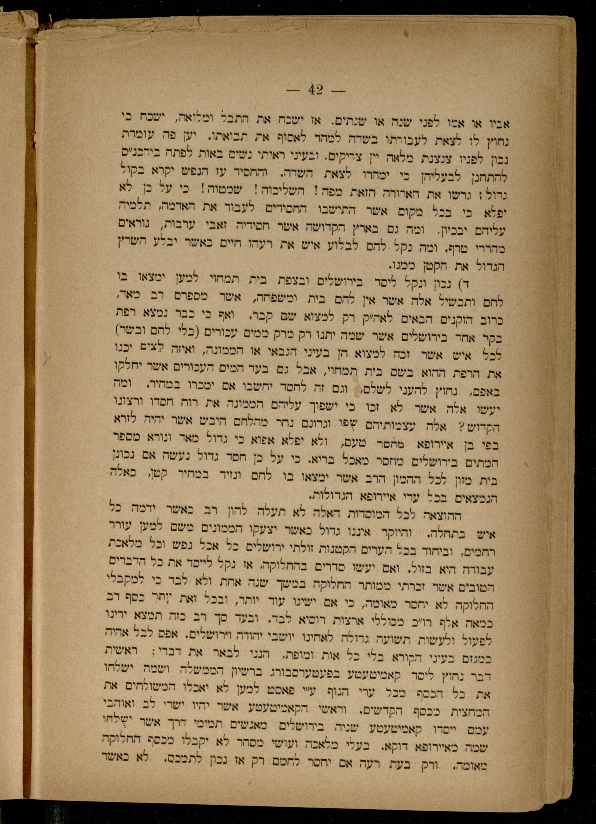 אביו או אמו לפני שנה או שנתים. או ישבה את התבל ומלואה, ישכח כו נחוץ לו לצאת לעבורתו בשרה למהר לאסוף את תבואתו. וען פה עומדת נבון לפניו צנצנת מלאה יין צריקים. ובעיני ראיתי נשים באות לפתה בירכנ'ם להתחנן לבעליהן כי| לצאת| השרה. והחסיד עז הנפש יקרא בקול גדול: גרשו את דארורה הואת מפה! השליכוה! שמטוה! בי על כן לא יפלא כי בכל בקום אשר. ההסידים. לעבור את הארמה, תלמיה עליהם יבכיון.| ומה גם. בארץ הקדושה אשר חמידיה. זאבי. ערבות,| נוראים מהררי טרף. ומה נקל להם לבלוע איש את רעהו היים כאשר יבלע השרץ הגדול את הקטן כמנו. ד) נכון ונקל ליסד בירושלים ובצפת בית תמחוי למען ימצאו בו לחם ותבשיל אלה אשר אין להם בית ומשפחה, אשר מספרם רב מאד, כרוב הזקנים הבאים לאהיק רק למצוא שם קבר. ואף כי כבר נמצא רפת בקר אחד בורושלים אשר שמה יתנו רק מרק ממים עכורים(בלי. להם ובשר) כל איש אשר זכה למצוא הן בעיני הגבאי או הממונה, ואיזה. לצים יכנו את הרפת ההוא בשם בות. תמחוי, אבל גם. בעד המים העכורים אשר יחלקו באפם, נחוץ להעני לשלם,. וגם זה לחסד יחשבו אם ימכרו במחיר.| ומה יעשו אלה אשר לא זכו כי ישפוך עליהם הממונה את רות חסדו ורצונו הקדוש? אלה עצמותיהם שפו וגרונם. נהר. מהלחם היבש אשר יהיה. לזרא בפי בן איירופא ממסר טעם, ולא יפלא אפוא כי גדול מאד ונורא מספר המתים בירושלים. מוזסר מאכל בריא. בי על כן חסד גדול נעשה אם נכונן בית מזון לכל ההמון הרב אשר ימצאו בו לתם וניר במהיר קטן; כאלה הנפצאים. בכל ערי איירופא. הגרולות, ההוצאה לכל המוסדות האלה לא תעלה להון רב כאשר ירמה כל איש בתחלה. והיוקר איננו גדול כאשר יצעקו הממונים משם למען עורר רחמים, וביחוד בכל הערים הקטנות זוסתי ירושלים כל אכל נפש וכל מלאכת עבודה היא בזול. ואם יעשו מדרים. בהתלוקה, או נקל לייסר את כל הדברים הטובים אשר זכרתי ממותר החלוקה במשך שנה אחת ולא לבד בי למקבלי החלוקה לא יחסר מאומה, בי אם ישיגו עוד יותר, ובכל זאת יֶתר כסף רב ככיאה אלף רויכ מכוללי ארצות רוסיא לבד. ובעד כך רב כזה תמצא ירינו לפעול ולעשות תשועה גדולה. לאתינו. יושבי יהודה וירושלים. אפס לבל אהיה כמגזם בעיני הקורא בלי בל אות ומופת, הנני לבאר את רברי; ראשית נחוץ ליסד קאמיטעטע בפעטערסבורג. ברשיון הממשלה ושמה ישלחו : מכל ערי הנוף עיי פאסט למען לא יאכלו המשולחים. את הקדשים. וראשי הקאמיטעטע אשר יהיו ישרי לב ואוהבי ייסרו| קאמיטעטע שניה. בירושלים| מאנשים תמימי דרך אשר ישְלחו שמה מאיירופא דוקא. בעלי מלאכה. ועושי. מפחר לא יקבלו מכסף החלוקה מאומה. ורק בעת רעה אם יחסר לחמם רק אז נכון לתנכם. לא כאשר