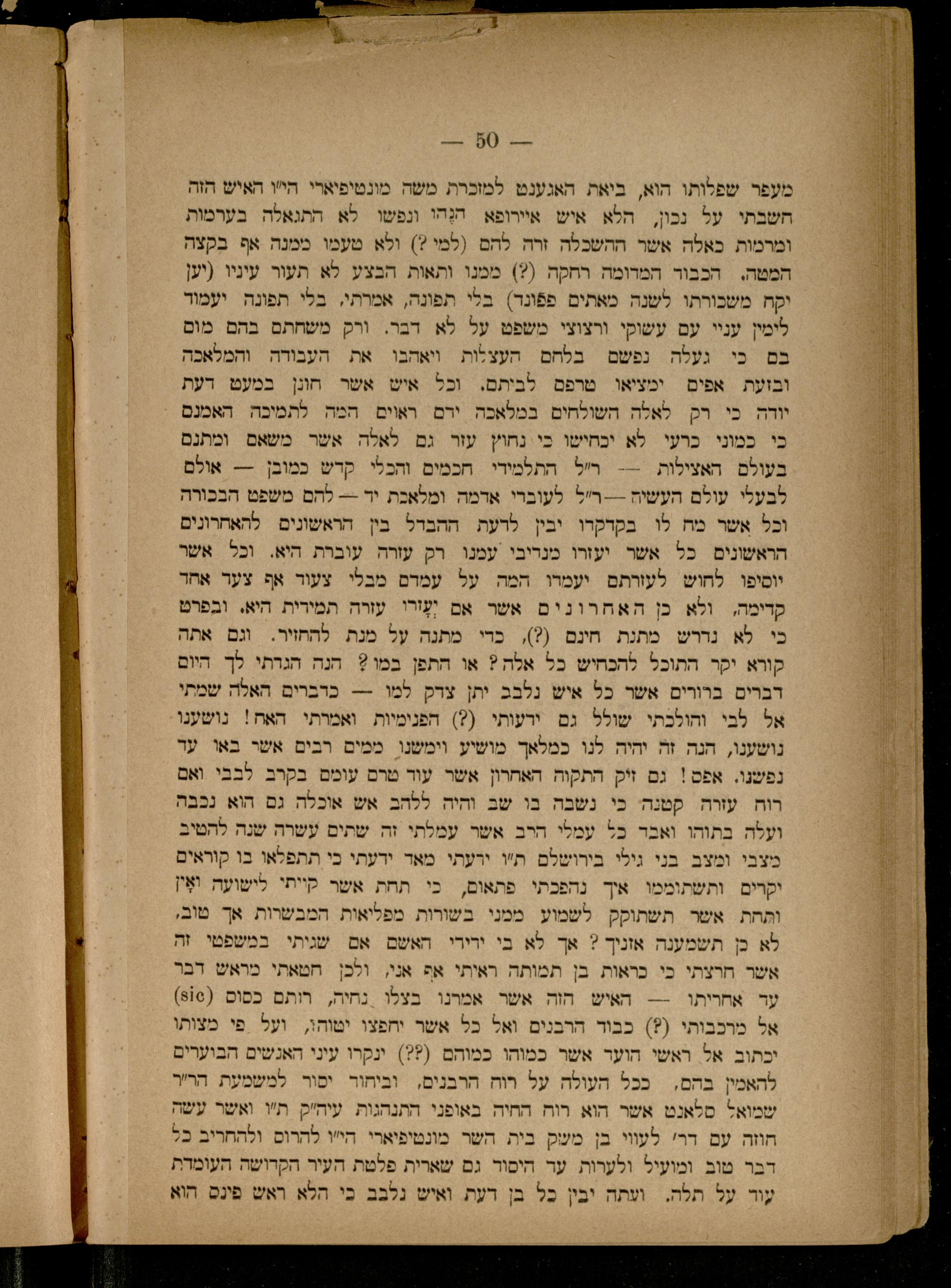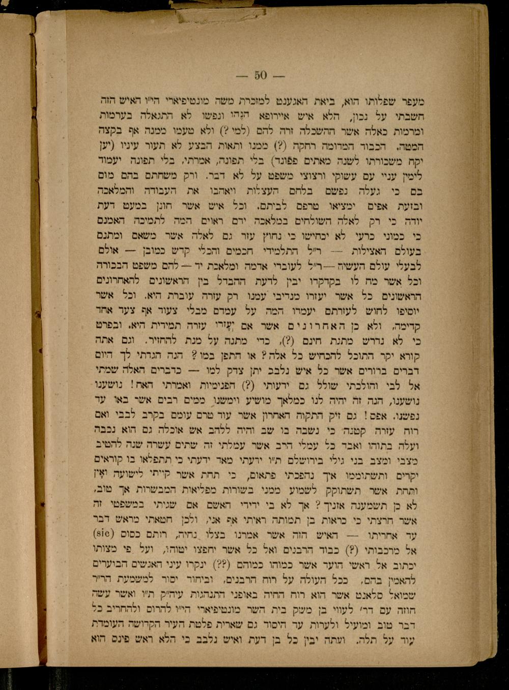מעפר שפלותו הוא, ביאת האגענט למזכרת משה מונטיפיארי היו האיש הזה חשבתי על נכן, הלא איש איירופא הנהו ונפשו לא התגאלה בערמות ומרמות כאלה אשר ההשכלה זרה להם(למי?) ולא טעמו ממנה אף בקצה המטה. הכבוד המדומה רחקה(?) ממנו ותאות הבצע לא תעור עיניו(יען יקח משכורתו לשנה מאתים פפונד) בלי תפונה, אמרתי, בלי תפונה יעמוד לימין עניי עם עשוקי ורצוצי משפט על לא דבר. ורק משחתם בהם מום בם כי געלה נפשם בלהם העצלות ויאהבו את העבודה והמלאכה ובזעת אפים ימציאו טרפם לבתם. וכל איש אשר הנן במעט דעת יודה כי רק לאלה השולחים במלאכה ירם ראוים המה לתמיכה האמנם כי כמני כרעי לא יכחישו בי נחוץ עזר גם לאלה אשר משאם ומתנם בעולם האצילות-- ר"ל התלמדי החכמים והכלי קדש כמובן-- אולם לבעלי עולם העשיה---ר"ל לעוברי אדמה ומלאכת יד-- להם משפט הבכורה וכל אשר מח לו בקדקרו יבין לדעת ההבדל בין הראשונים להאחרונים הראשונים כל אשר יעזרו מנדיבי עמנו רק עזרה עוברת היא. וכל אשר יויסיפו לחוש לעזרתם יעמרו המה על עמדם מבלי צעור אף צער אהד קדימה, ולא כן האחרונים אשר אם יעְזרו. עזרה תמירית היא. ובפרט כי לא נדרש מתנת חינם(?), כרי מתנה על מנת להחזיר. וגם אתה קורא יקר התוכל להבחיש כל אלה? או התפן במו? הנה הגדתי לך היום דברים ברורים אשר כל איש נלבב יתן צדק למו-- כדברים האלה שמתי אל לבי והולכתי שולל גם ירעותי(?) הפנימיות ואמרתי האח! נושענו נושענו, הנה זה יהיה לנו כמלאך מושיע וימשנו ממים רבים אשר באו עד נפשנו. אפס! גם זיק התקוה האחרון אשר עור טרם עומם בקרב לבבי ואם רות עזרה קטנה בי נשבה בו שב והיה ללהב אש אוכלה גם הוא נכבה ועלה בתוהו ואבד כל עמלי הרב אשר עמלתי זה שתים עשרה שנה להטיב מצבי ומצב בני גילי בירושלם ת"ו ירעתי מאד ירעתי בי תתפלאו בו קוראים יקרים ותשתוממו איך נהפבתי פתאום, כי תחת אשר קויתי לישועה ואָין ותחת אשר תשתוקק לשמוע ממני בשורות מפליאות המבשרות אך מוב, לא כן תשמענה אזניך? אך לא בי ידידי האשם אם שגיתי במשפטי זה אשר חרצתי כי כראות בן תמותה ראיתי אף אני, ולכן חטאתי מראש דבר עד אחריתו-- האיש הזה אשר אמרנו בצלו נחיה, רותם כסום(816) אל מרכבותי(?) כבוד הרבנים ואל כל אשר יחפצו יטוה, ועל פי מצותו יכתוב אל ראשי הוער אשר כמוהו כמוהם(??) ינקרו עיני האנשים הבוערים להאמין בהם, ככל העולה על רוה הרבנים, וביחור יסור למשמעת הר"ר