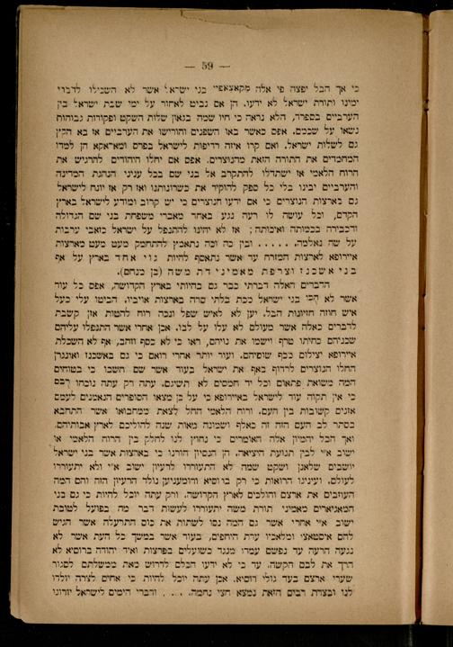 כי אך הבל יפצה פי אלה מקאצאפיי בני ישרא' אשר לא השילו לדבוי ימינו ותורת ישראל לא ירעו. הן אם נבים לאחור על ימי שבת ישראז בין הערביים בספרר, הלא נראה כי חיו שמה. בגאון שלות השקט ופקודות גבוהות נשאו על שככם. אפס כאשר באו השפנים והורישו את הערביים אז בא הקץ גם לשלות ישראל. ואם קרו איזה רדיפות. לישראל בפרם ומאדאקא הן למדו המחמדים את התורה הזאת מהנוצרים. אפס אם יחלו היהודים להרגיש את הרוח הלאמי אז ישתדלו להתקרם אל בני שם בכל עניני. הנהגת המדינה והערביים יבינו בלי כל ספק להוקיר את כשרונותנו ואז רק אז יונח לישראל גם בארצות הנוצרים כי אם ירעו הנוצרים כי יש קרוב ומודע לישראל בארץ הקדם, וכל עושה לו רעה נגע באחד מאברי משפחת בני שם הגדולה ודכבירה. בכמותה ואיכותה; אז לא יהינו להתנפל על ישראל כזאבי ערבות על שה נאלמה...... ובין בה ונה נתאבץ להתחמק מעט מעט מארצות איירופא לארצות המזרה עד אשר נתאסף להיות גוי אחד בארץ על בני אשכנז וצרפת מאמיני דת משה(בן בנחם).